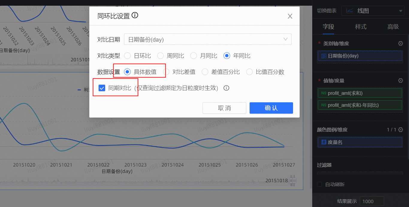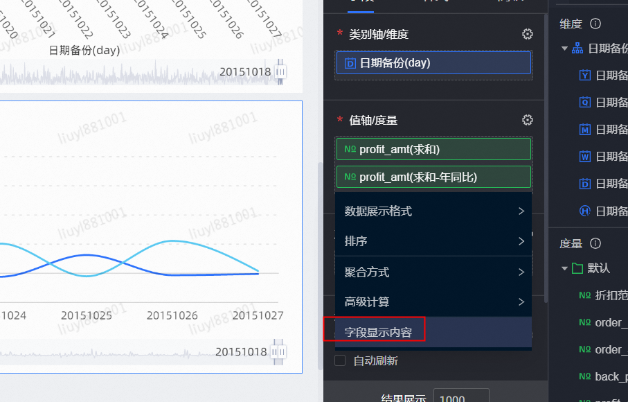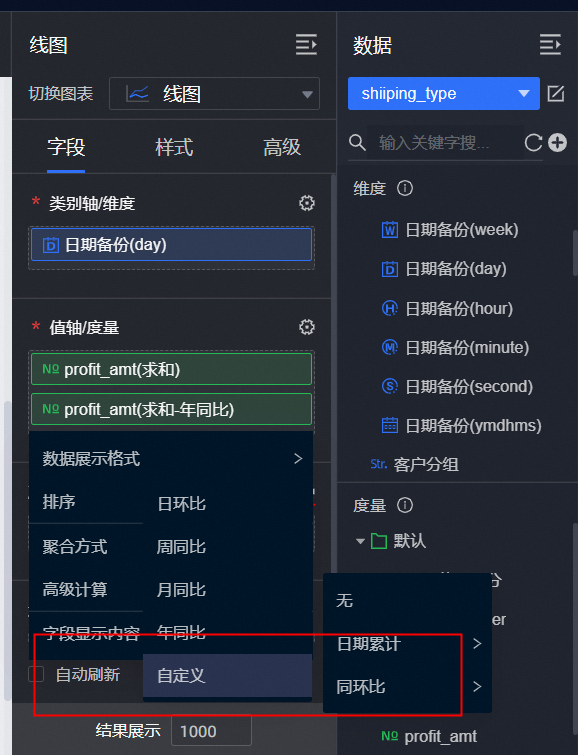 度量字段中profit_amt字段展示两次,并设置其中一个自定义同环比: