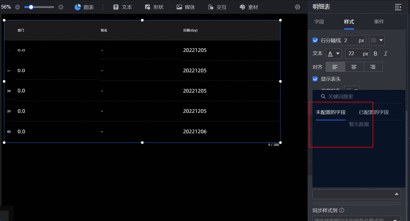 Quick BI数据大屏明细表样式中设置字段的条件格式,发现加载不到字段: