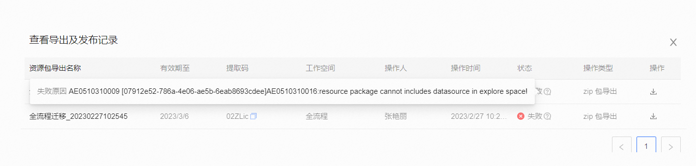 Quick BI资源包导出报错:“AE0510310016:resource package cannot includes datasource in explore space!”