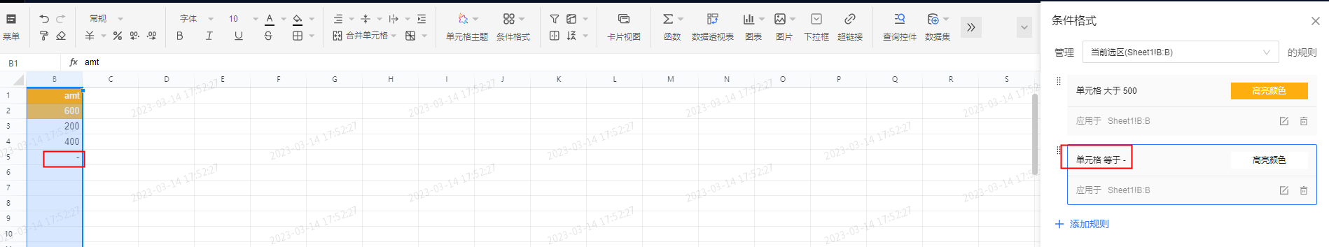 不想对空值显示高亮可以再配置一条规则,当值为"-"时没有任何格式: