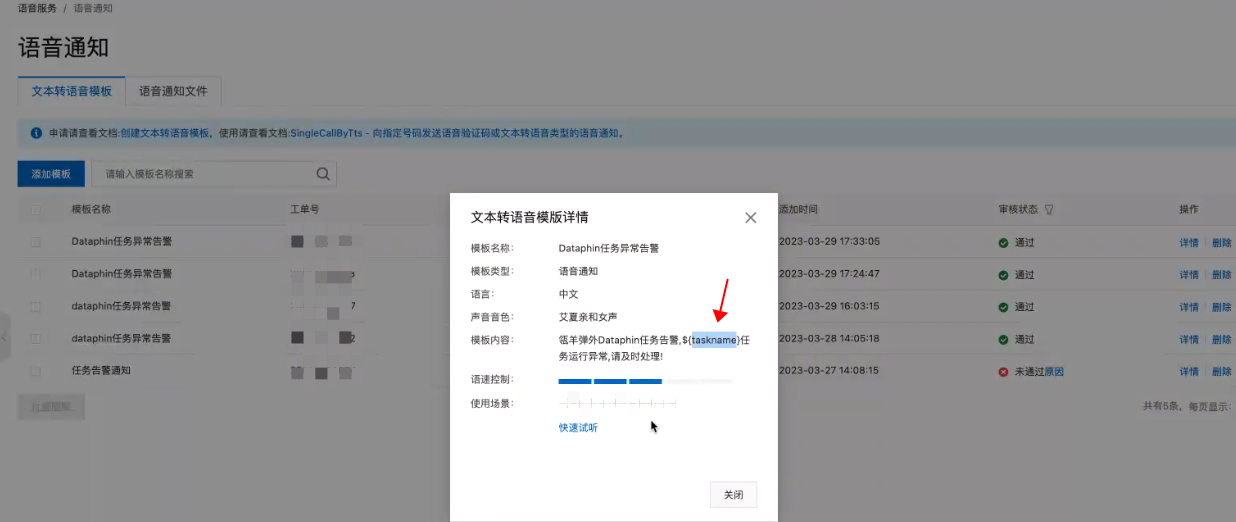 Dataphin中语音告警中需要展示报错任务的详情。阿里云语音服务是自己的模板,现在Dataphin语音告警只能提示有任务出错了,希望语音中具体提示哪个任务出错了,播报出错任务详情。