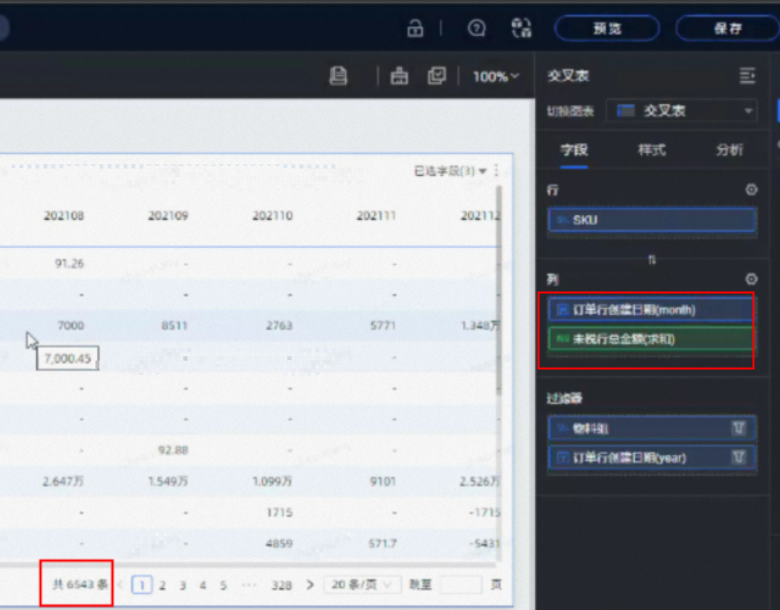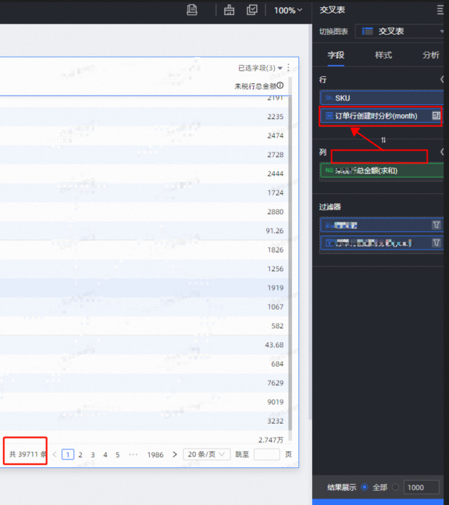 仪表板新交叉表列字段中有维度时,这种场景导出的1万超限限制指的是行列维度交叉的个数,不再是单纯的行数。如下图所示,如果将图表列字段中的维度拖拽至行字段中,可以看到图表数据实际总行数已经超过1万。
