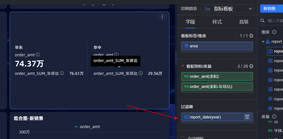 Quick BI指标看板中,维度字段不是日期,如何展示同环比数据呢?方法如下: