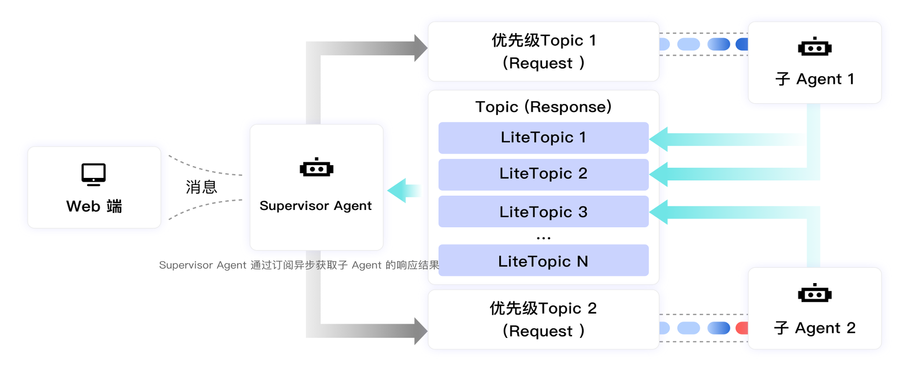 子 Agent 处理将每个任务的响应结果发送到Topic (Response) 的LiteTopic中。LiteTopic可以用任务ID命名,为每个任务创建一个专属的LiteTopic。