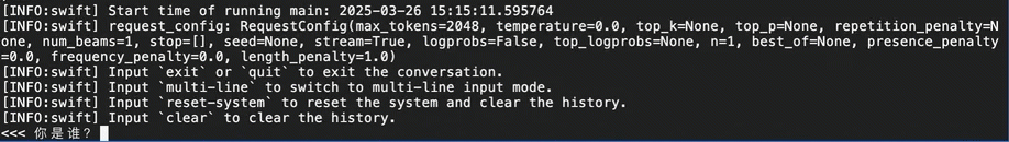 # Bucket挂载目录 BUCKET_MOUNT_PATH="/mnt/oss-data" CUDA_VISIBLE_DEVICES=0 swift infer \ --model $BUCKET_MOUNT_PATH/DeepSeek-R1-Distill-Qwen-7B \ --stream true \ --infer_backend pt \ --max_new_tokens 2048如图所示,模型加载完成后,您可以与大模型进行对话。如果模型权重文件加载失败,请重新下载模型权重文件。