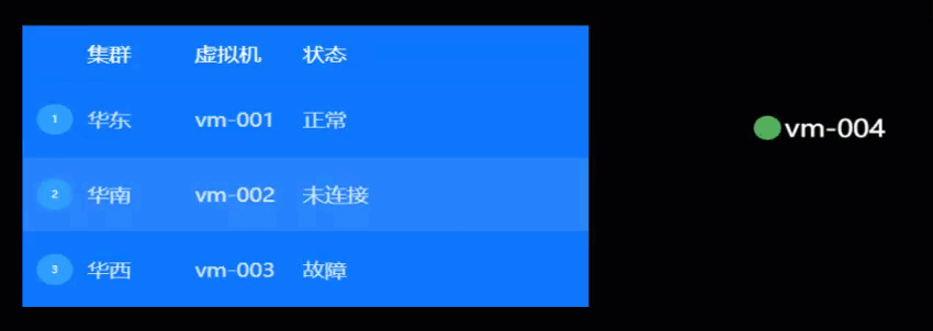 本案例通过轮播列表与状态卡片进行交互,展示不同地区的虚拟机状态。单击轮播列表的某一行后,状态卡片将动态显示该地区对应虚拟机的状态。
