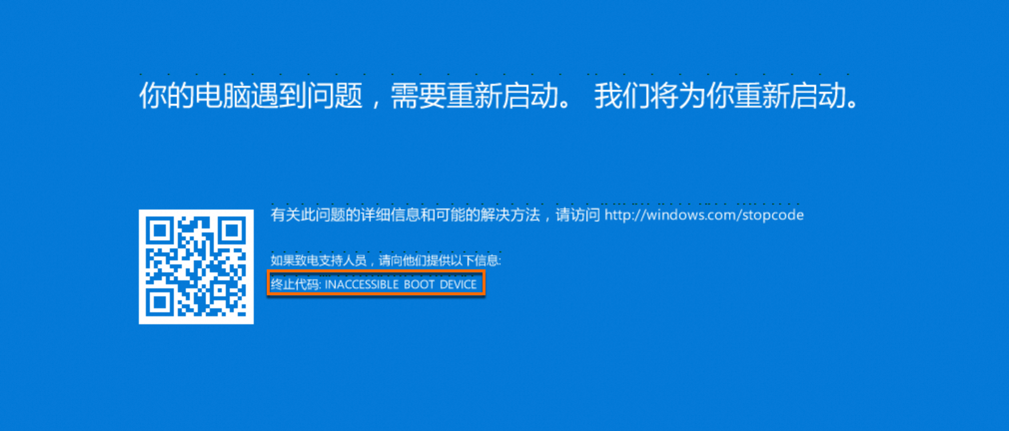 实例在ECS控制台启动后,无法通过远程桌面连接(RDP)访问。通过VNC远程连接登录实例,观察到操作系统在引导过程中蓝屏,并提示Stop Code: (INACCESSIBLE_BOOT_DEVICE)