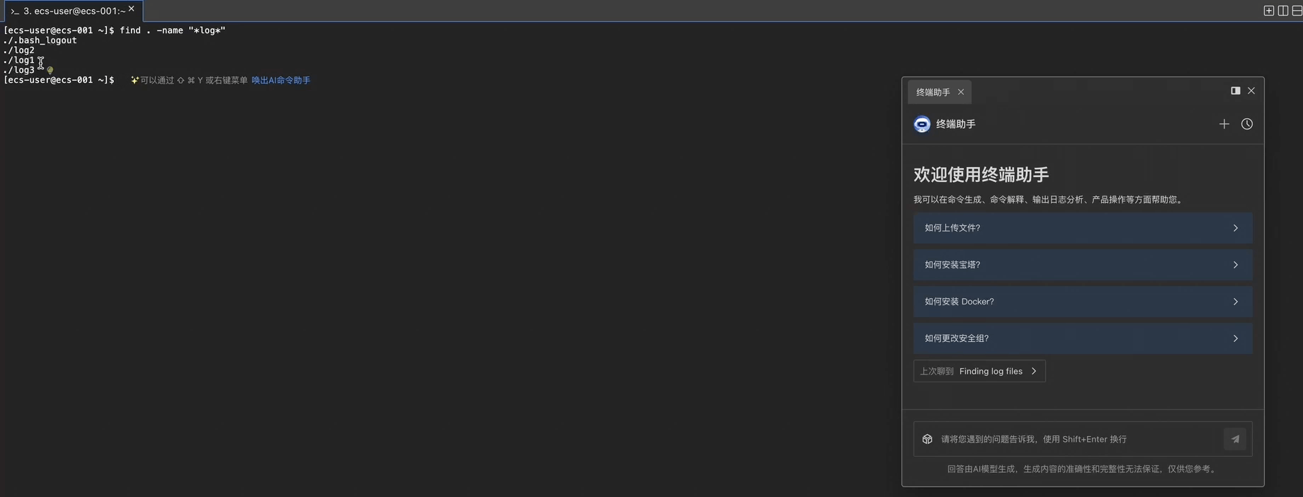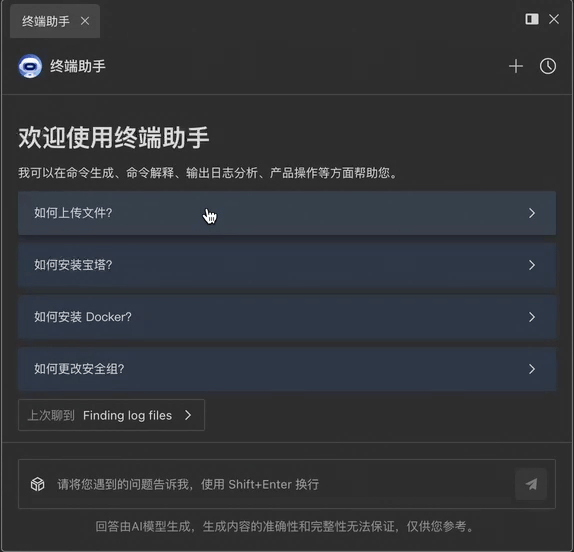 您可以通过对话的形式询问终端助手,辅助您完成运维操作。具体操作步骤如下: