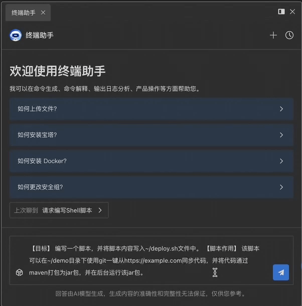 Workbench终端助手是基于大语言模型的智能工具,该功能可以帮助您快速生成运维脚本或命令,高效完成各类运维任务。此外,如果您在使用Workbench过程中遇到困难,也可以通过智能问答功能查找相应解决方案。