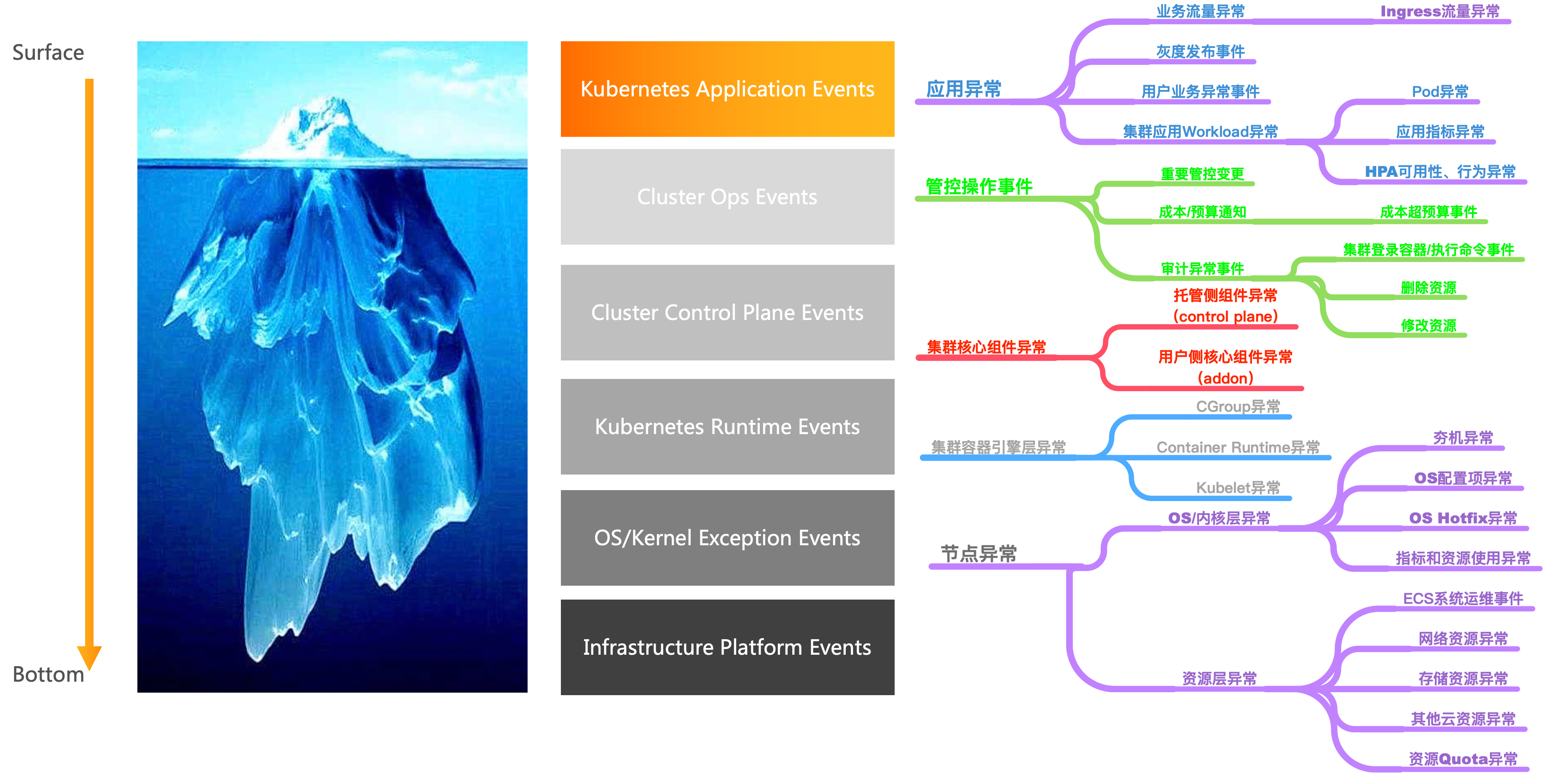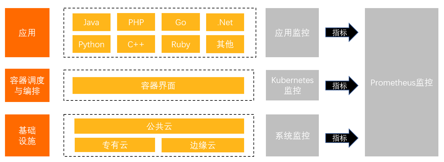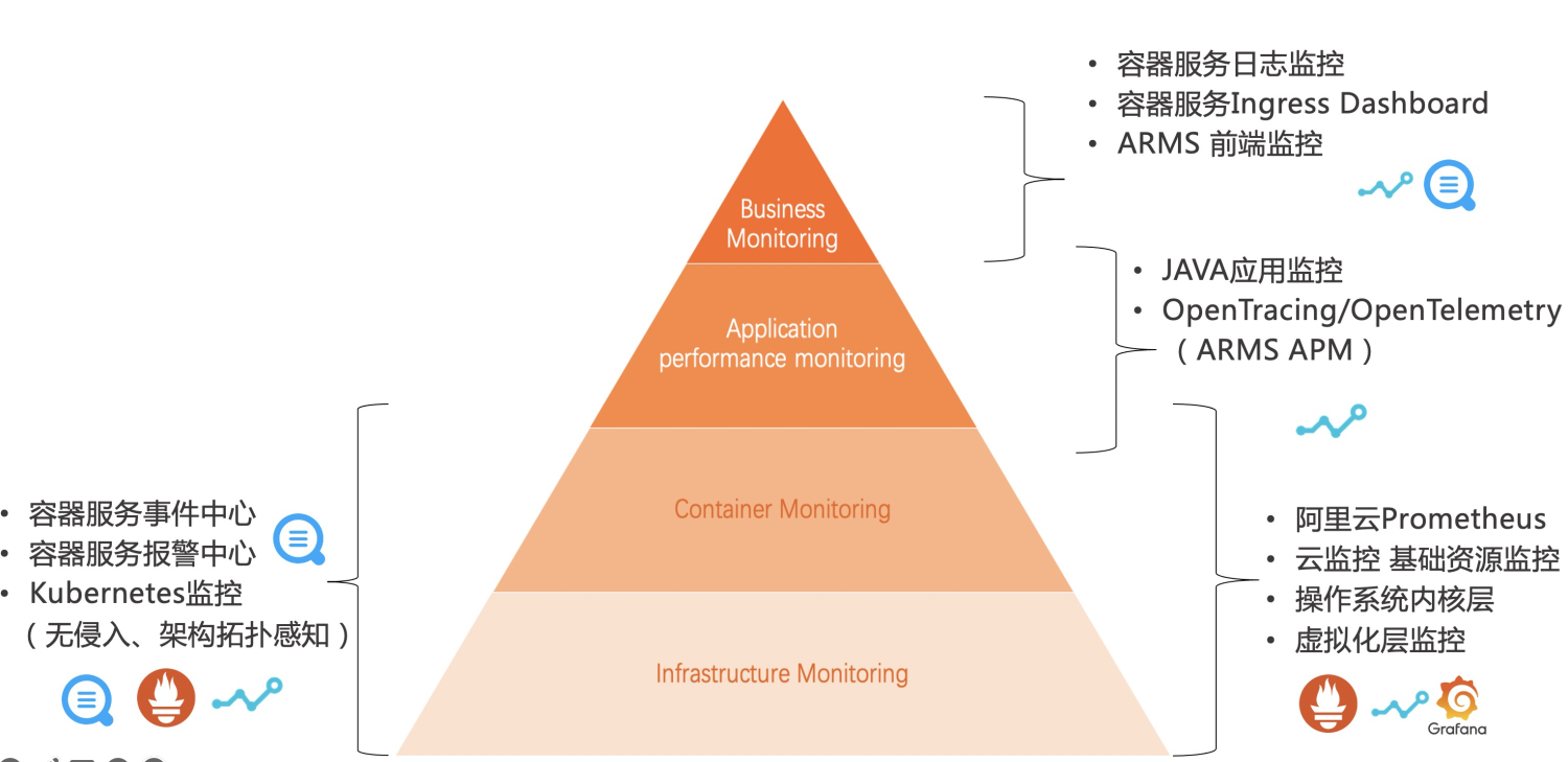 以ACK为基础的系统架构可以粗略分为4个层次。自下而上分别是:基础设施层、容器性能层、应用性能层、用户业务层。每层可以使用指标、日志、事件等可观测性方式进行监控。