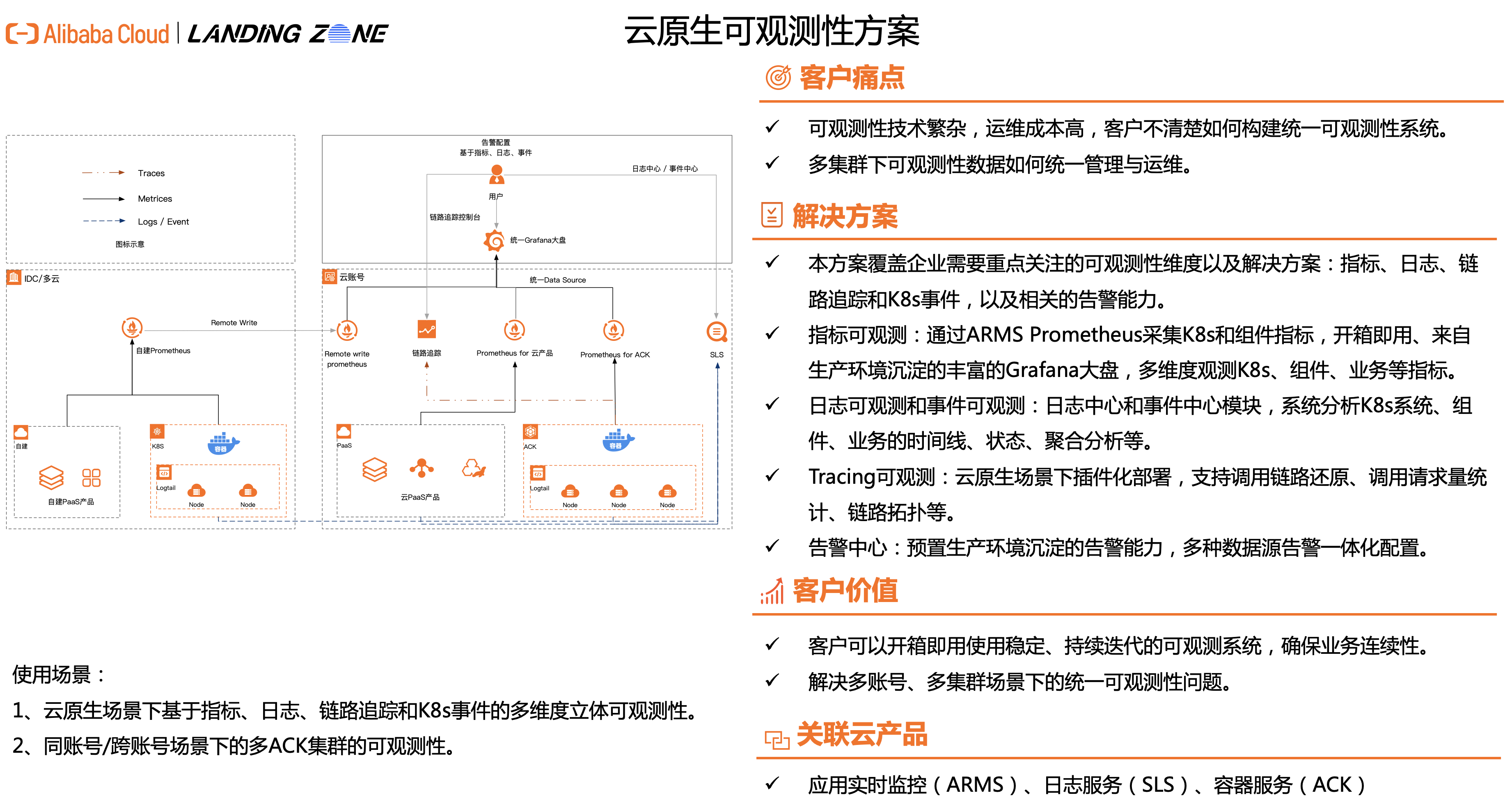 - 用户业务层可观测性:基于容器服务ACK构建的业务系统的具体业务场景,例如基于容器服务构建一套高可用可扩展的网站,网站的业务运营数据PV、UV等,例如应用的成本审计场景等。