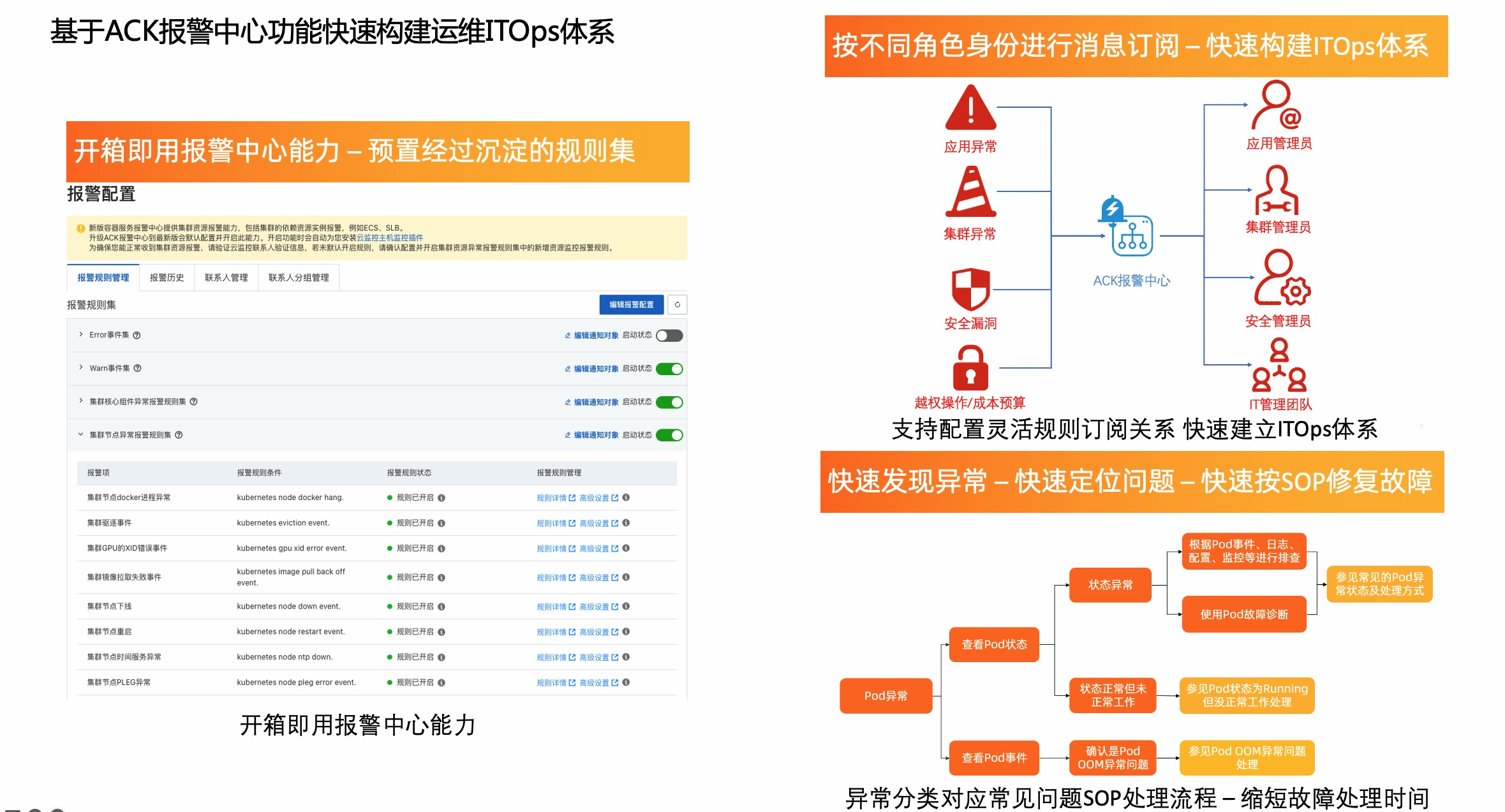 - ACK事件中心已经封装好了常见的异常事件告警,实现了开箱即用的事件告警能力。例如:Pod OOM、系统OOM、Pod驱逐、Pod Pending等等。