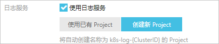 - 在组件配置配置项页中,选中使用日志服务,表示在新建的Kubernetes集群中安装日志插件。当选中使用日志服务后,会出现创建项目(Project)的提示。关于日志服务管理日志的组织结构,请参见项目(Project))。有以下两种创建Project方式。