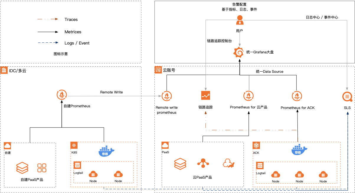 对于使用多账号的企业客户来说,如何将多个账号内的数据打通实现统一聚合告警非常关键。本方案也提供了一种打通多个账号的数据源,实现综合可观测实践。