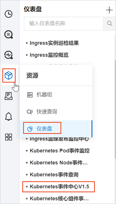 - 在左侧导航栏中,单击仪表盘,然后单击Kubernetes事件中心V1.5。