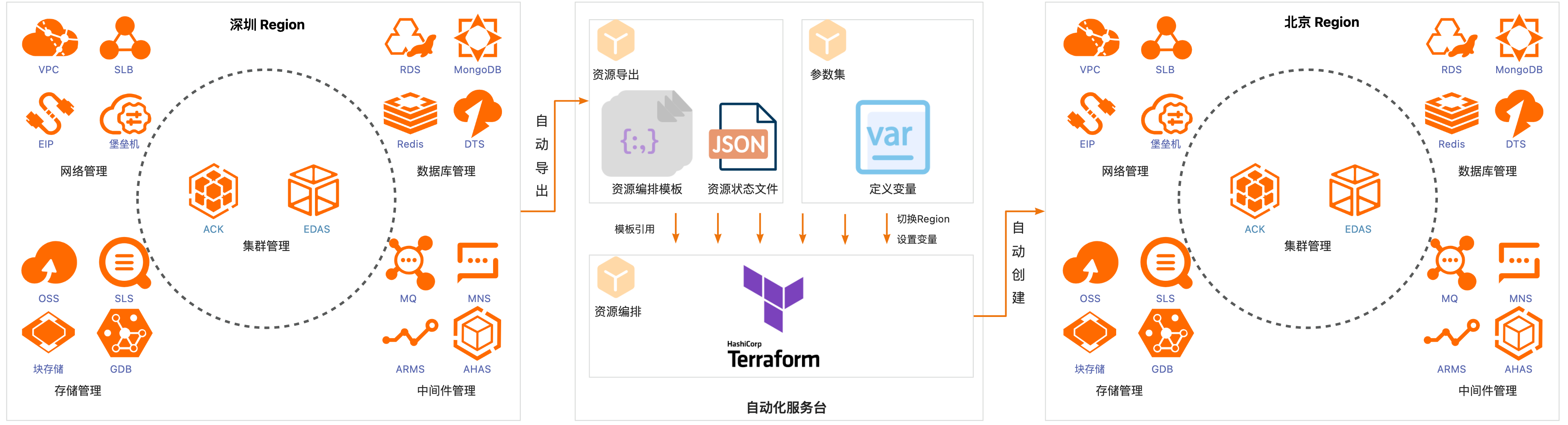 基于自动化服务台提供的自动导出能力,将客户在深圳Region的所有云资源以及资源关系自动化的导出为 Terraform 编排模板和对应的资源状态文件,然后通过参数变量将原有模板中的地域配置从深圳(cn-shenzhen)切换到北京(cn-beijing),如果还涉及到其他资源属性的修改,也可以通过参数变量来进行修改和替换。最后,基于利用资源编排工具 Terraform 实现导出后的资源在北京地域的自动化创建,最终完成资源架构的跨区域自动迁移。