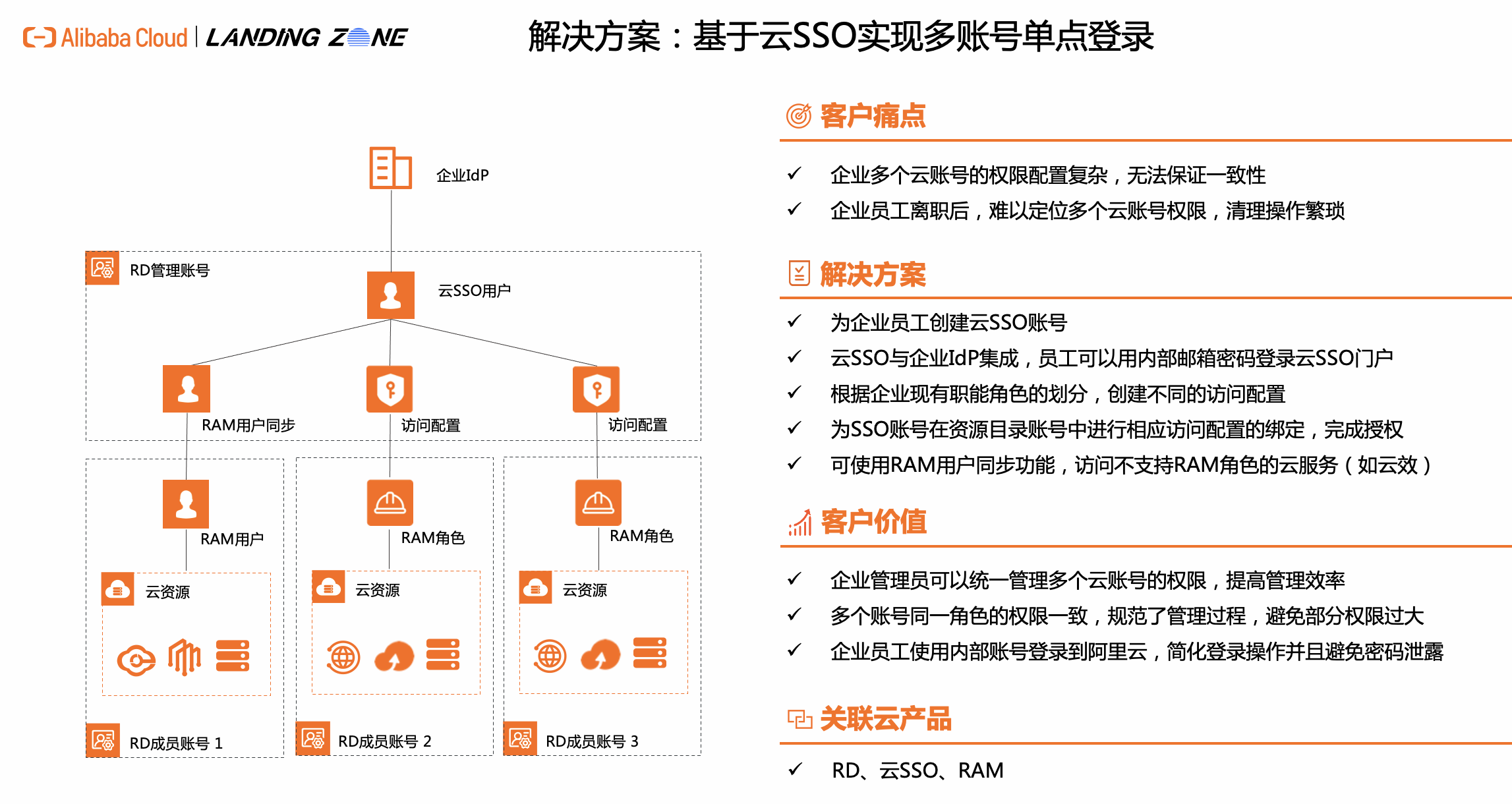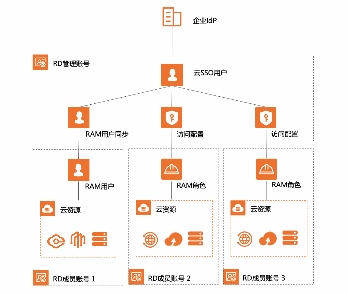 企业在云SSO集中管理访问阿里云的用户,通过访问配置和多账号授权,实现用户通过单点登录的方式登录到资源目录成员内的RAM角色,然后访问该RD成员中的云资源。优先以RAM角色登录,适用于支持RAM角色的云服务。