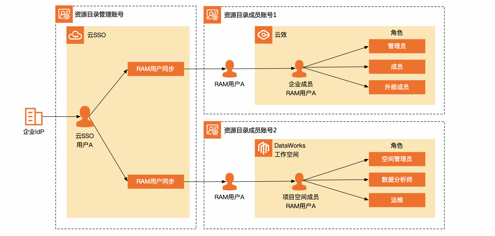 企业在云SSO集中管理访问阿里云的用户,通过RAM用户同步,实现用户登录到资源目录成员内的RAM用户,然后访问该RD成员中的云资源。以RAM用户登录适用于不支持RAM角色的云服务。