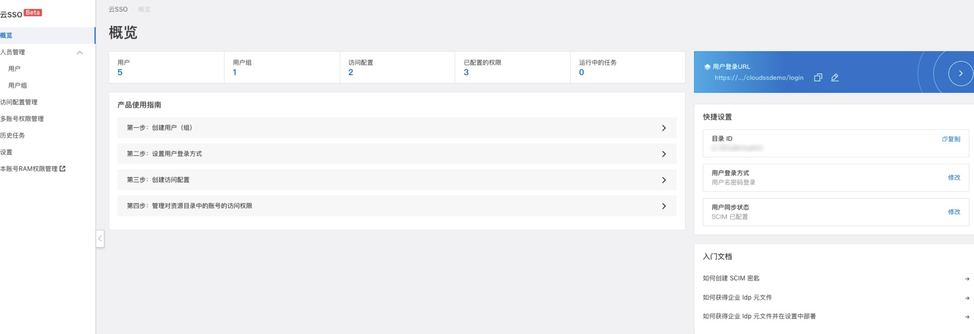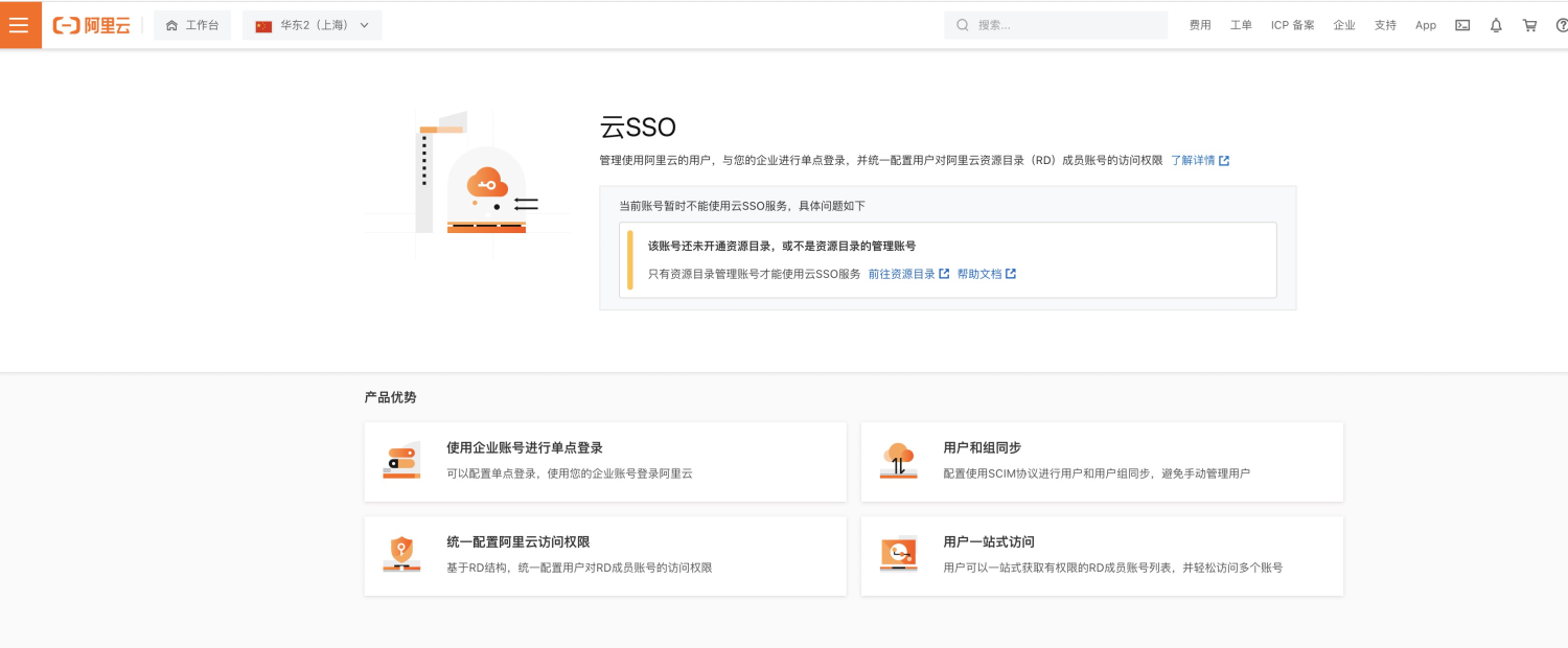 使用云SSO的前提是账号需要开通资源目录,只有资源目录管理账号才能使用云SSO服务。