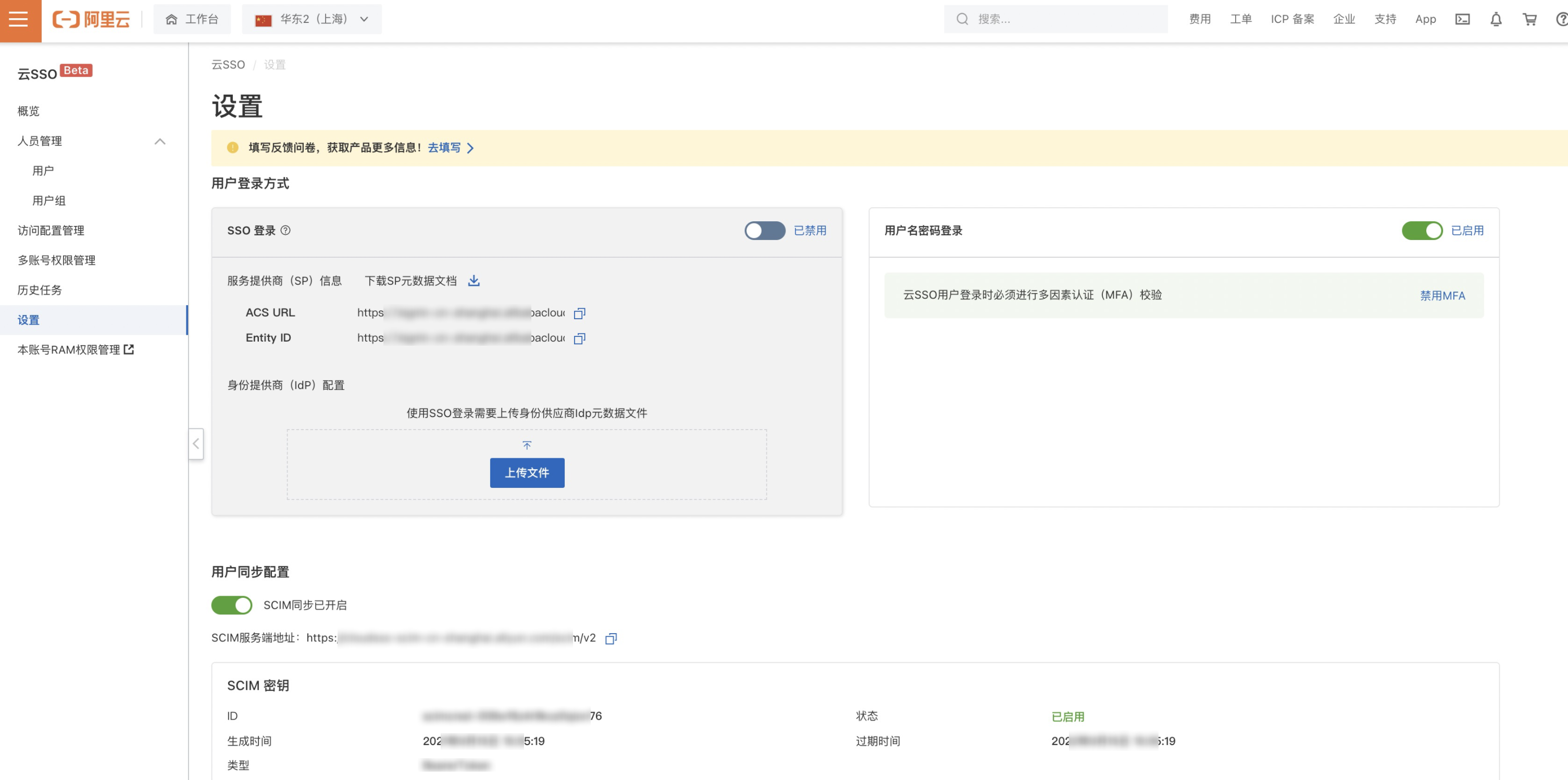 - 在云SSO中配置企业IdP为可信SAML IdP。您需要上传企业IdP元数据文件,并启用SSO登录功能。具体操作,请参见启用单点登录。