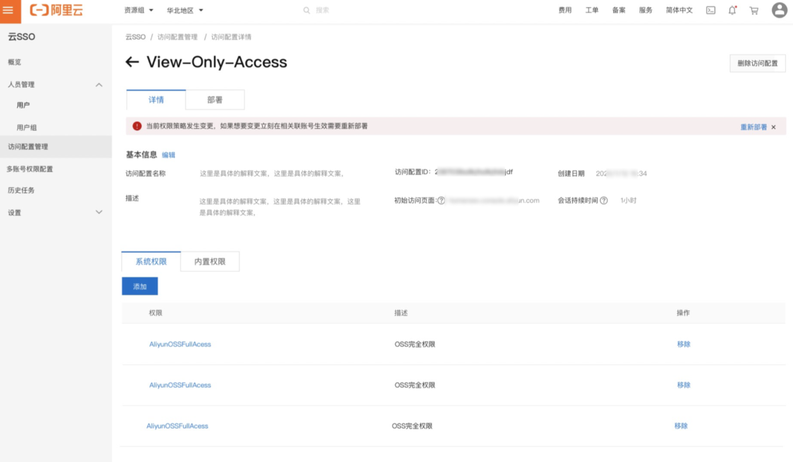 - 在访问配置详情页查看该访问配置被部署在了哪些账号,以及哪些身份拥有使用此访问配置的权限。