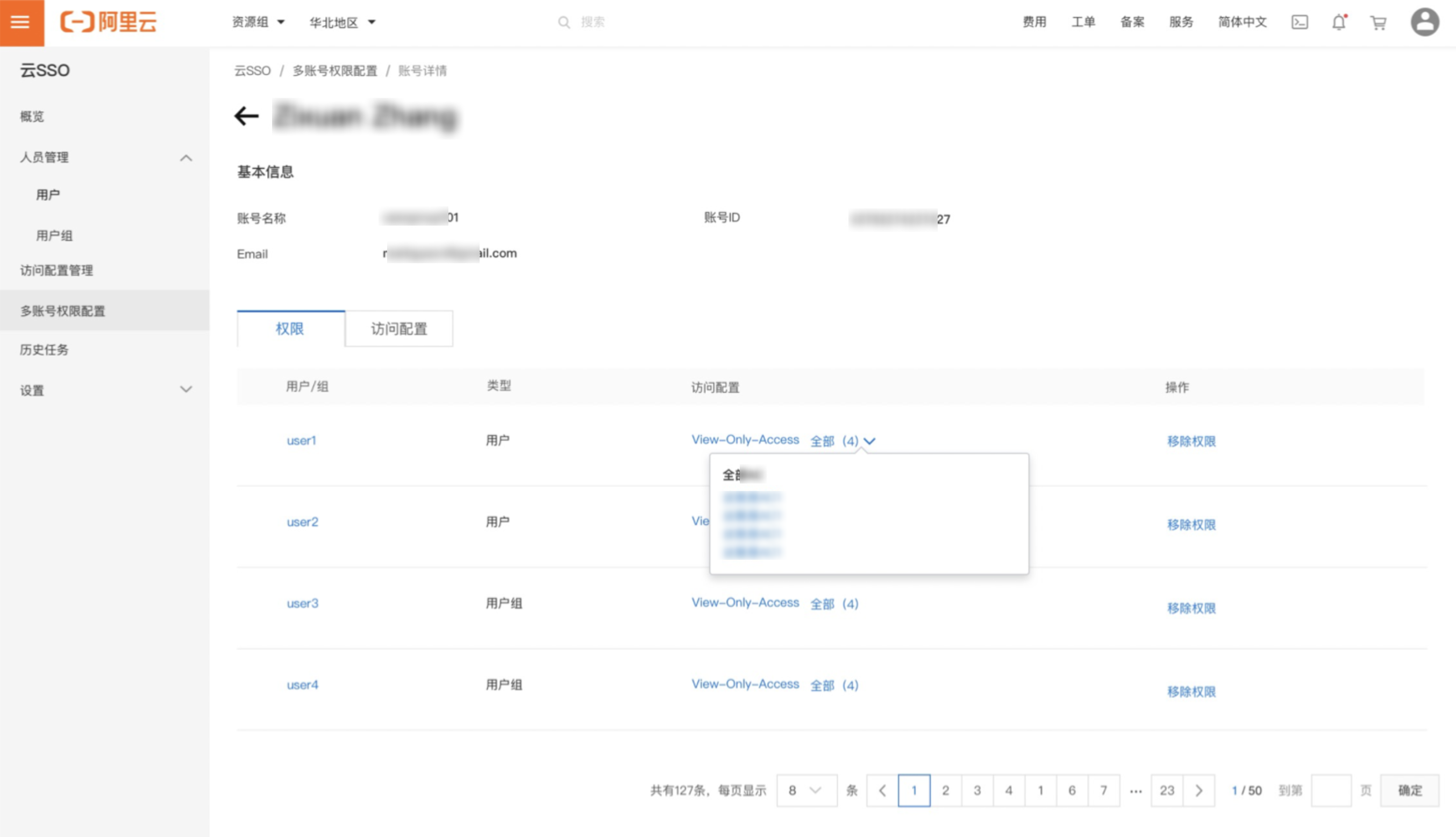 - 在用户/用户组详情页查看该身份对哪些账号有哪些访问权限。