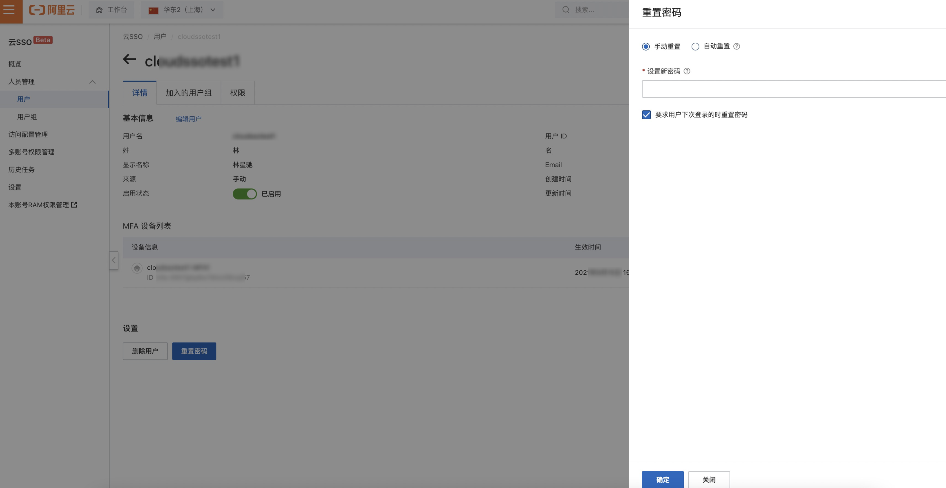 多因素认证MFA(Multi-Factor Authentication)是一种简单有效的最佳安全实践,在用户名和密码之外再额外增加一层安全保护。当云SSO用户使用用户名和密码登录时,默认开启多因素认证。目前,云SSO支持MFA设备作为多因素认证方式。更多信息,请参见管理MFA。 |
