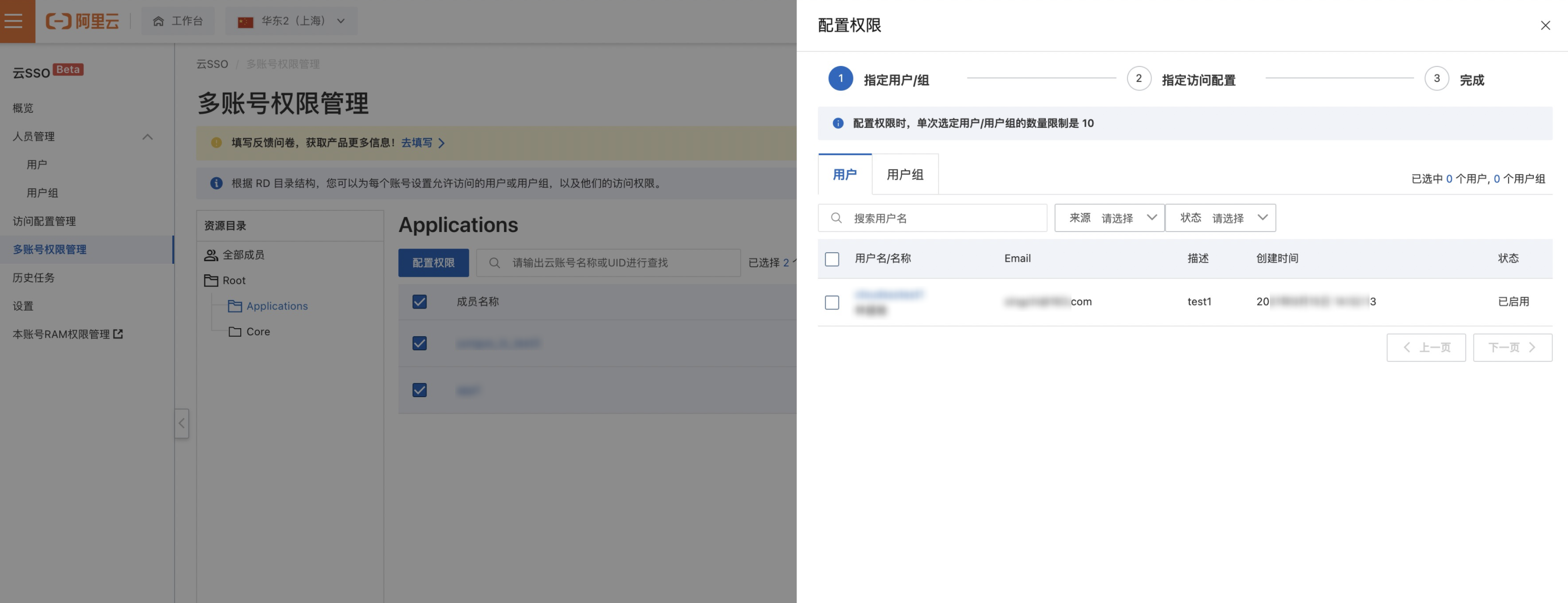 借助与RD的深度集成,当使用RAM角色访问目标成员账号时,在云SSO中您可以统一配置用户或用户组对整个RD内的任意成员账号的访问权限。根据RD的组织结构,选择不同成员账号为其分配可访问的身份(用户或用户组)以及具体的访问权限,且该权限可以随时修改和删除。