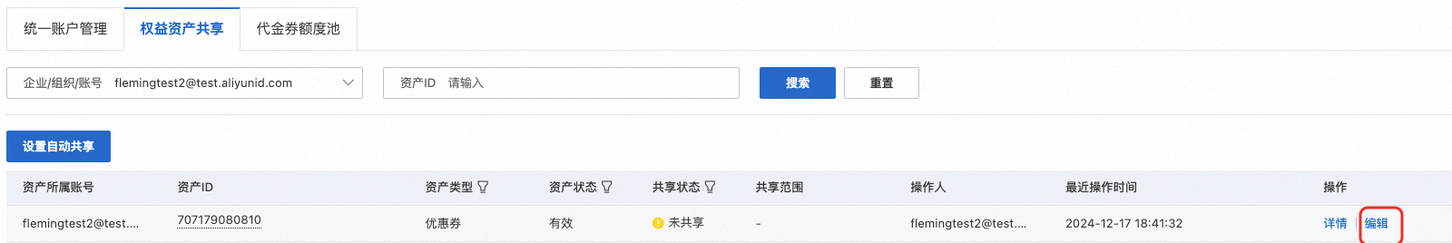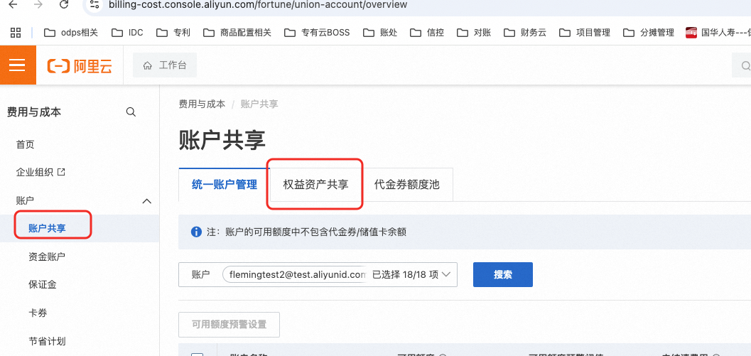 - 登录拥有代金券的账号,打开费用与成本,操作代金券共享: