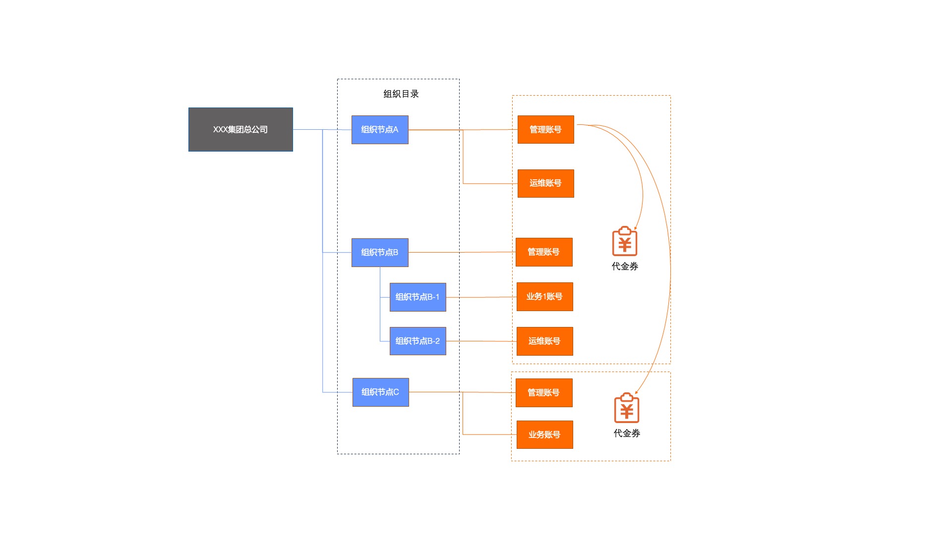 本方案使用企业账号中心作为多账号的统一管理框架,集团的管理账号进行集中的代金券申请,并且统一下发给到企业账号中心内的各个成员账号。