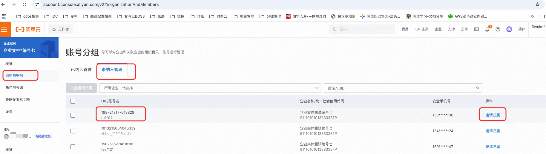 - 企业实体超级管理员登录到企业账号中心控制台,前往“企业组织”中,把要共享代金券的目标账号邀约到企业超级管理员管理范围内:
