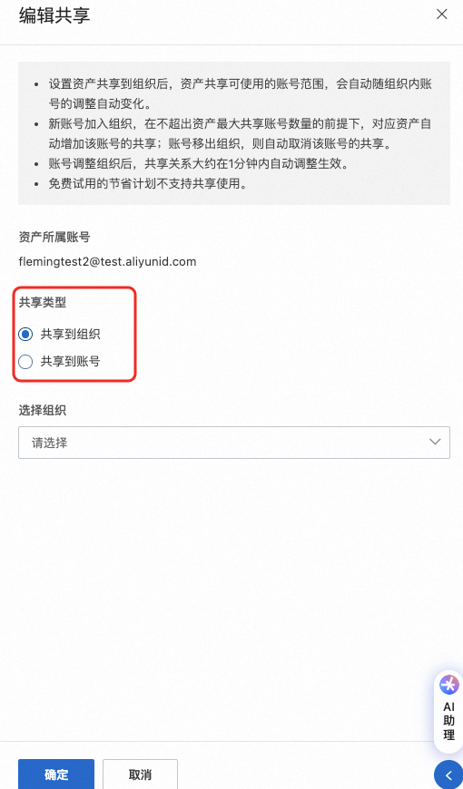 - 选择共享到组织还是共享到账号,共享到账号输入目标账号即可;