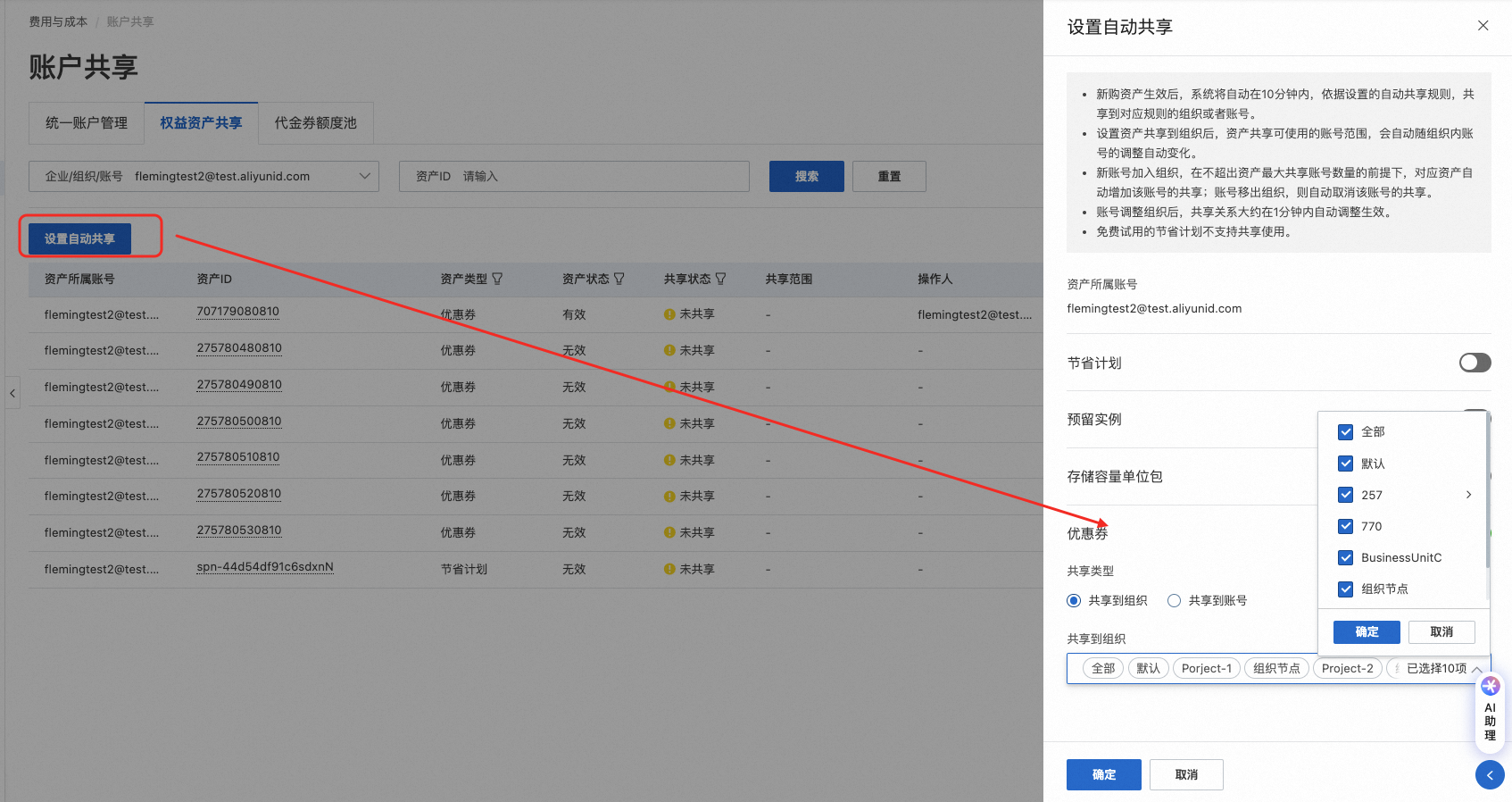 - 如果要对主账号下的优惠券默认共享给所有账号,可以设置自动共享规则,后续新增的账号只要纳入到对应管理的组织节点下,就可以使用主账号的优惠券;也可以选择要共享的组织目录;