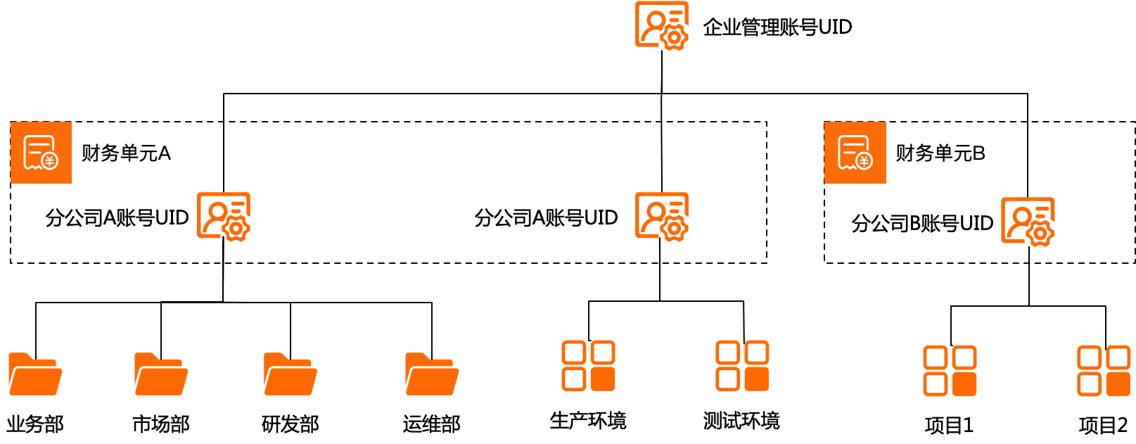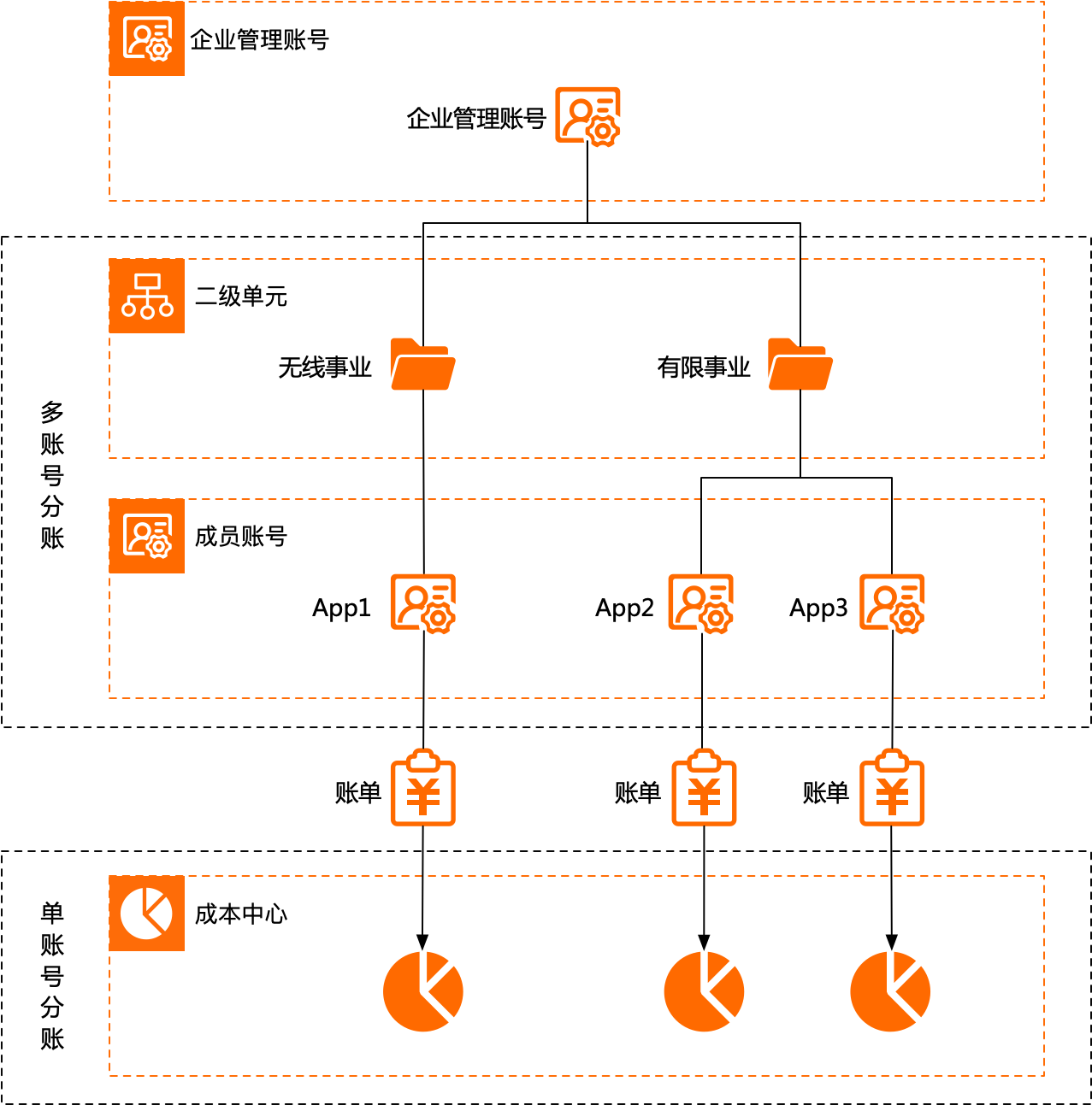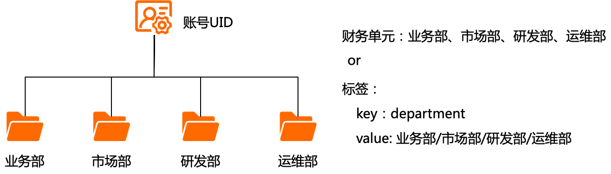 - 单账号多级财务分账:通过在单个账号内,对资源进行多维度打标,或创建多级财务单元来实现。