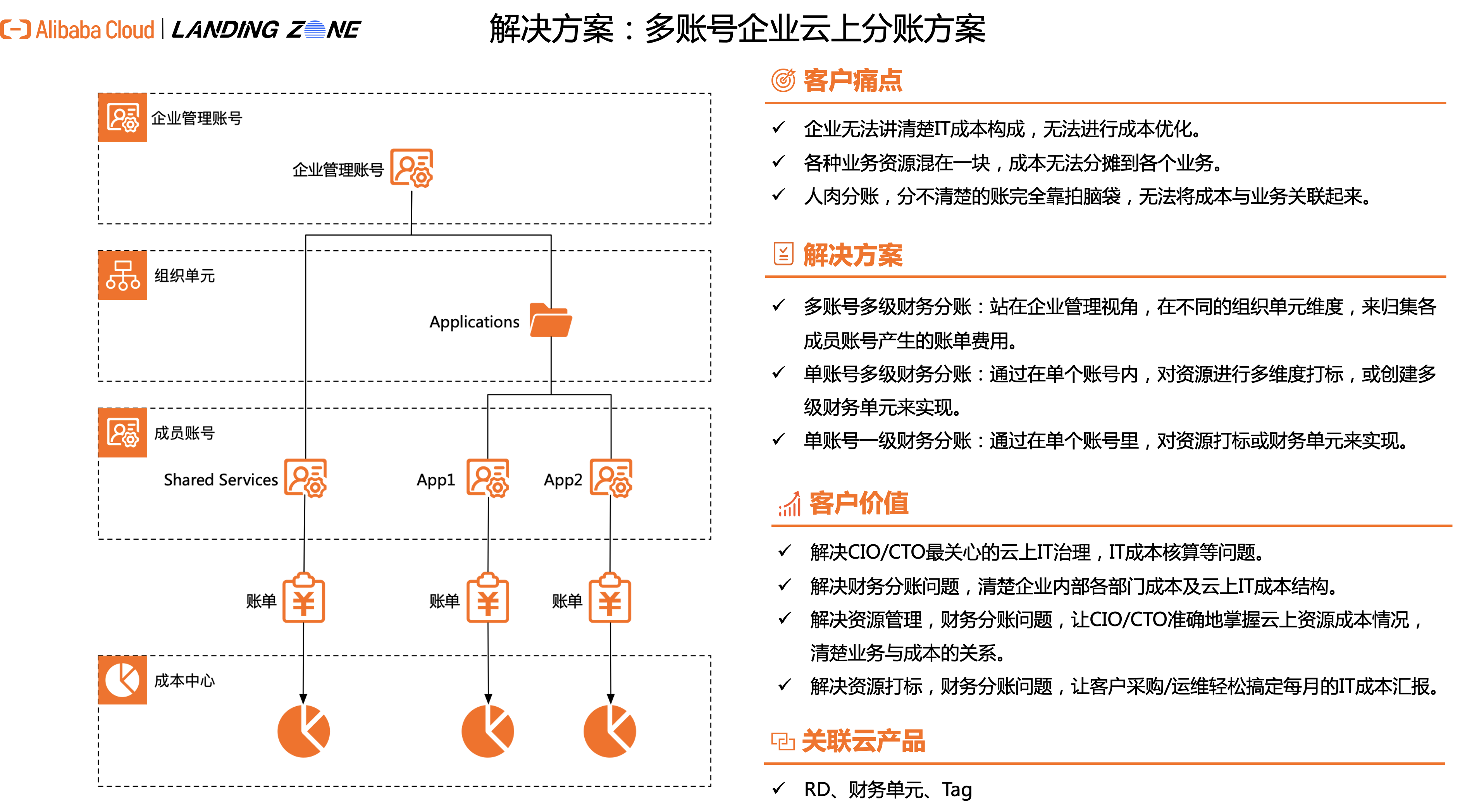 本方案旨在给企业提供多种组织模式下的财务管理方案,包括单账号、多账号的多级分账方案。从而解决云上IT成本核算、财务分账等问题。