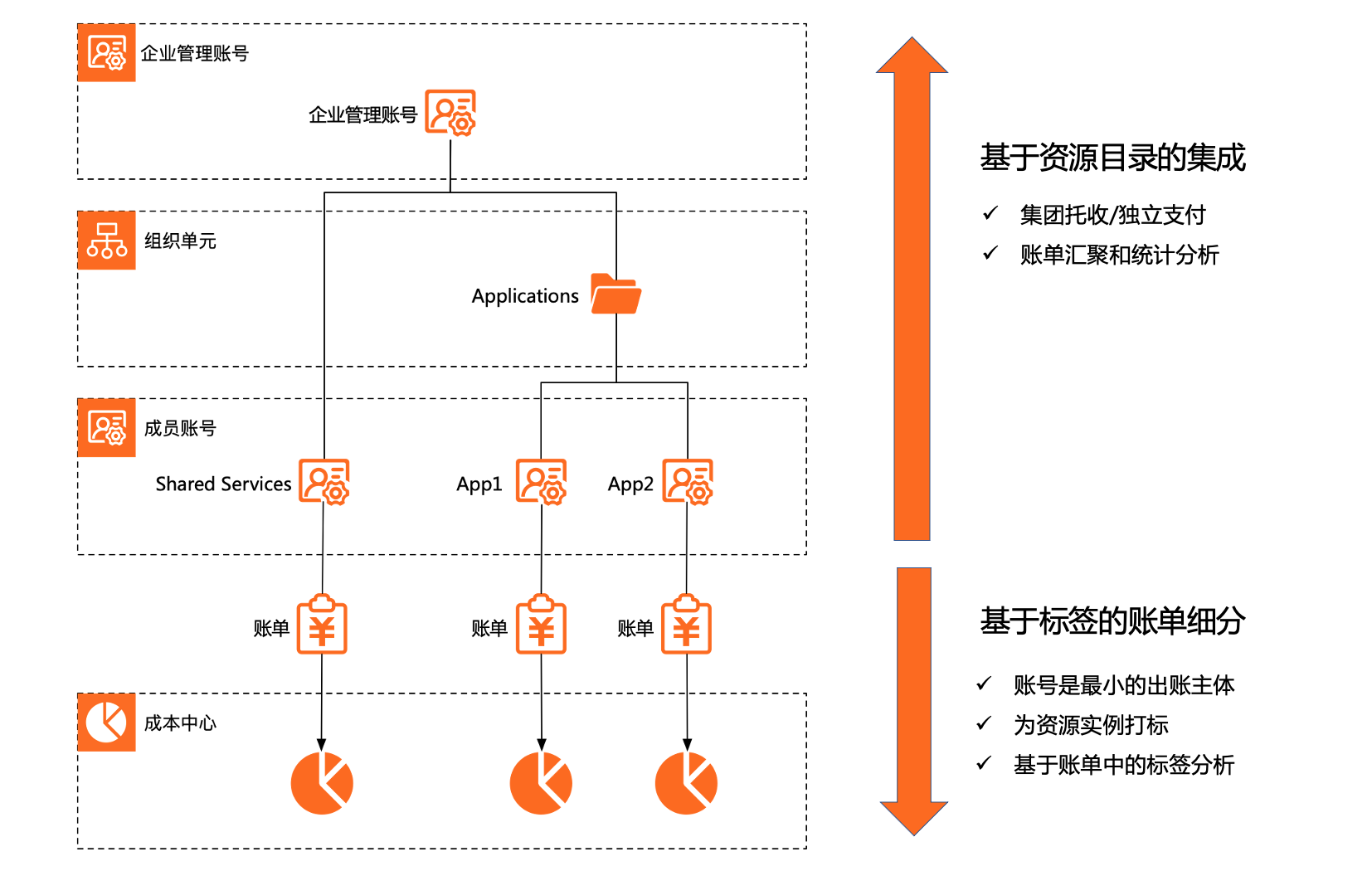 - 多账号多级财务分账:站在企业管理视角,在不同的组织单元维度,来归集各成员账号产生的账单费用。