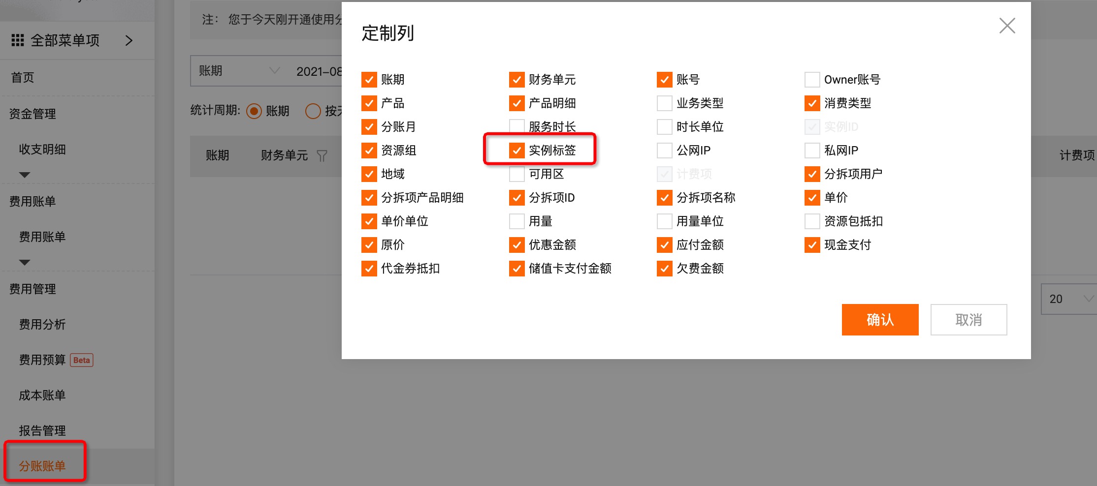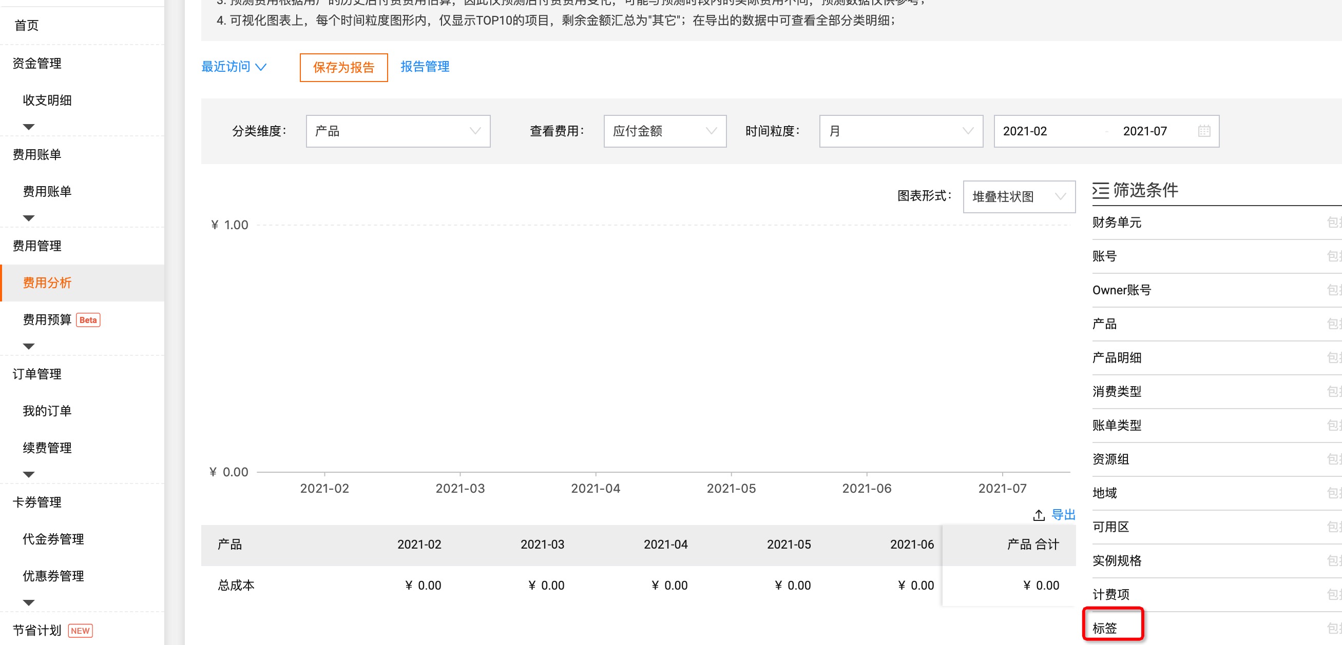 步骤1 开通费用中心 -> 费用分析 功能,这个功能可在T+1后根据标签进行分账。