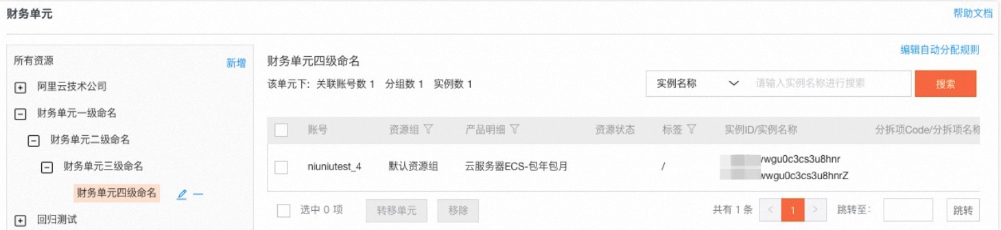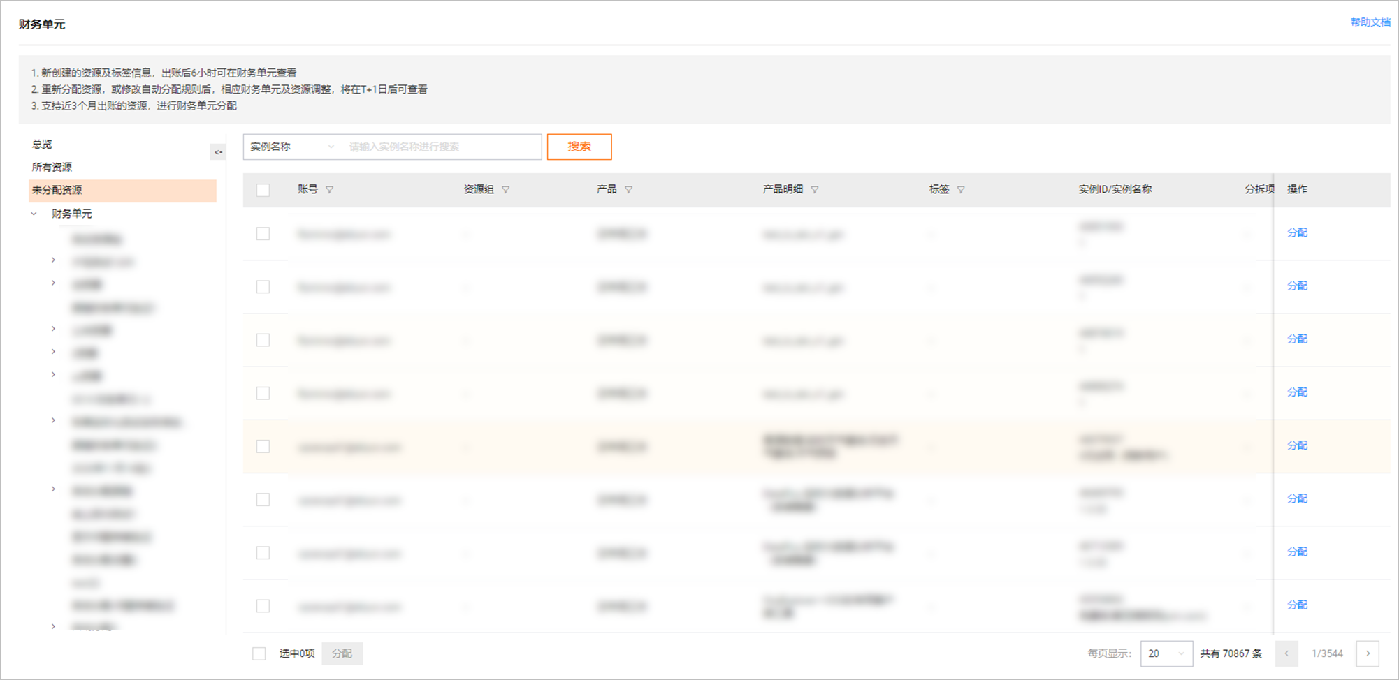 用户登录“用户中心”,在“分账管理 - 财务单元”页面中,点击左侧“未分配资源”,用户可以查看所有还没有分配到任一“财务单元”的资源实例,并可以将资源实例分配到指定的“财务单元”中。
