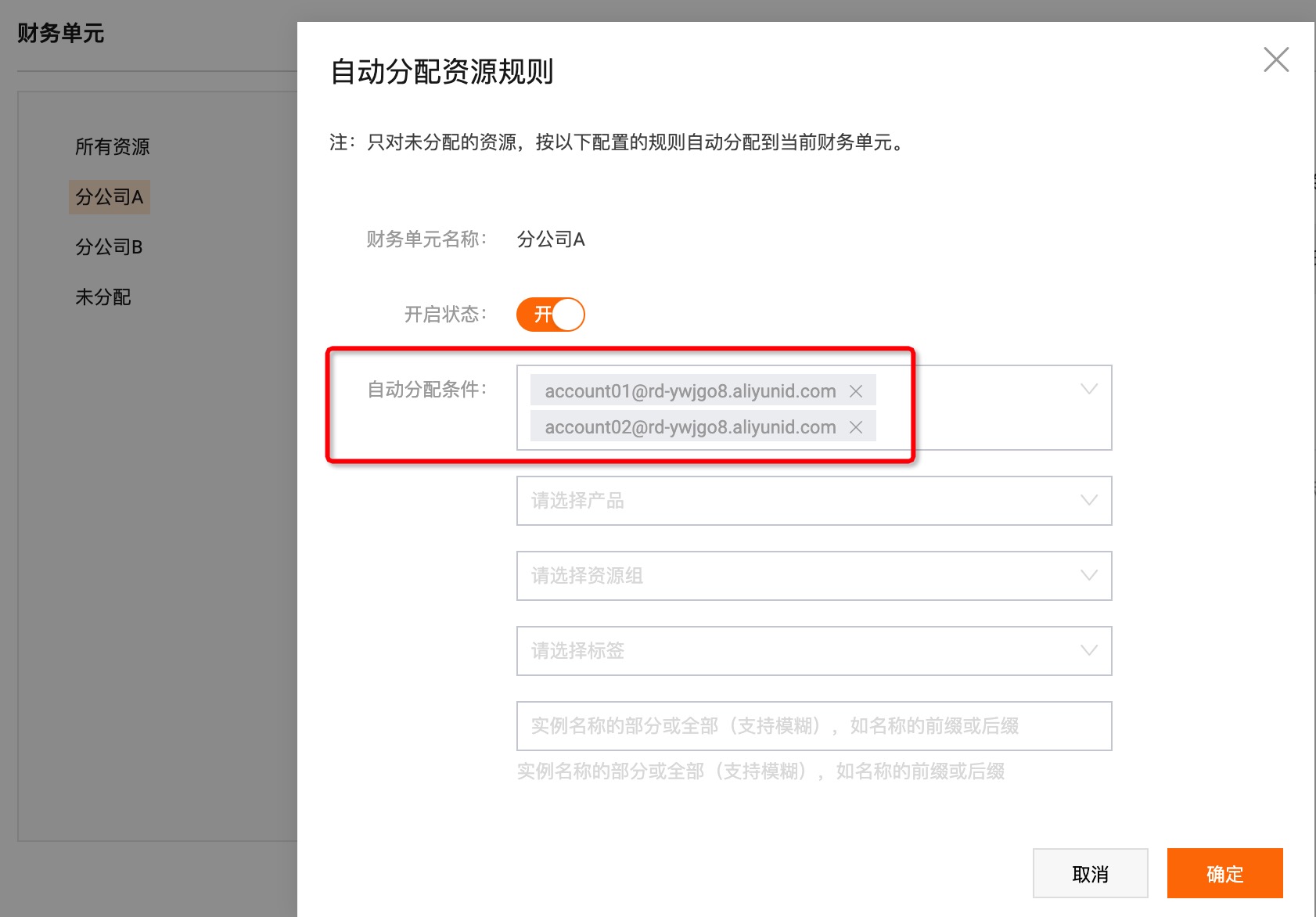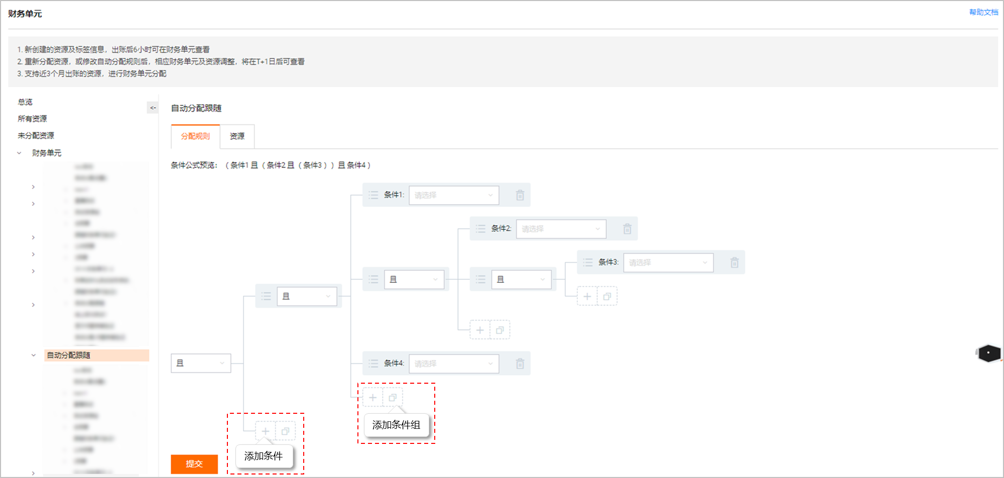 用户登录“用户中心”,进入“分账管理 - 财务单元”,在左侧目录中选择一个“财务单元”,点击“分配规则”页签,可以设置“自动分配”规则: