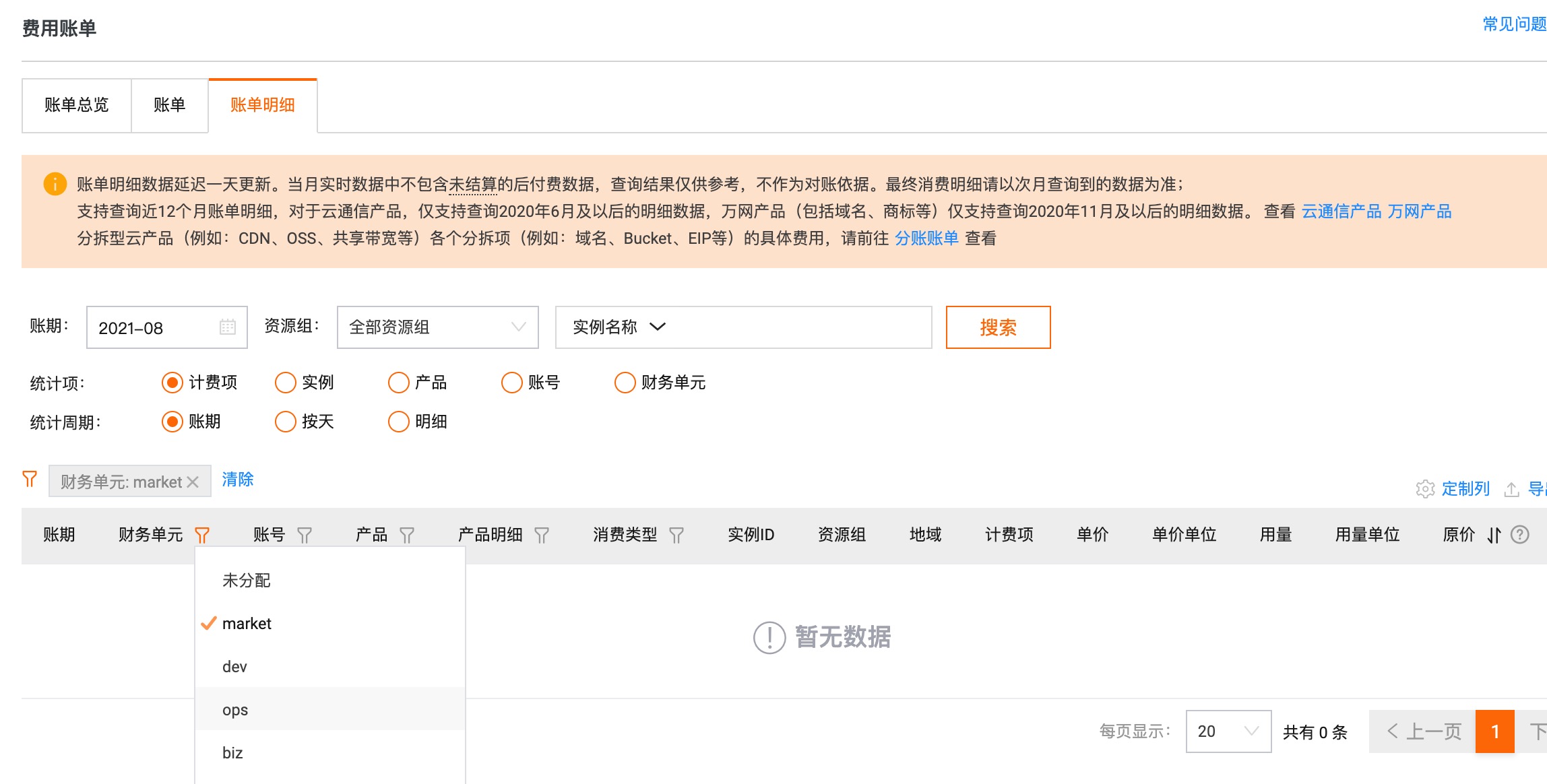 通过财务单元与标签映射的方式进行分账,资源按照标签分组管理后,通过创建对应的财务单元,将标签对应到财务单元实现按财务单元汇总账单。