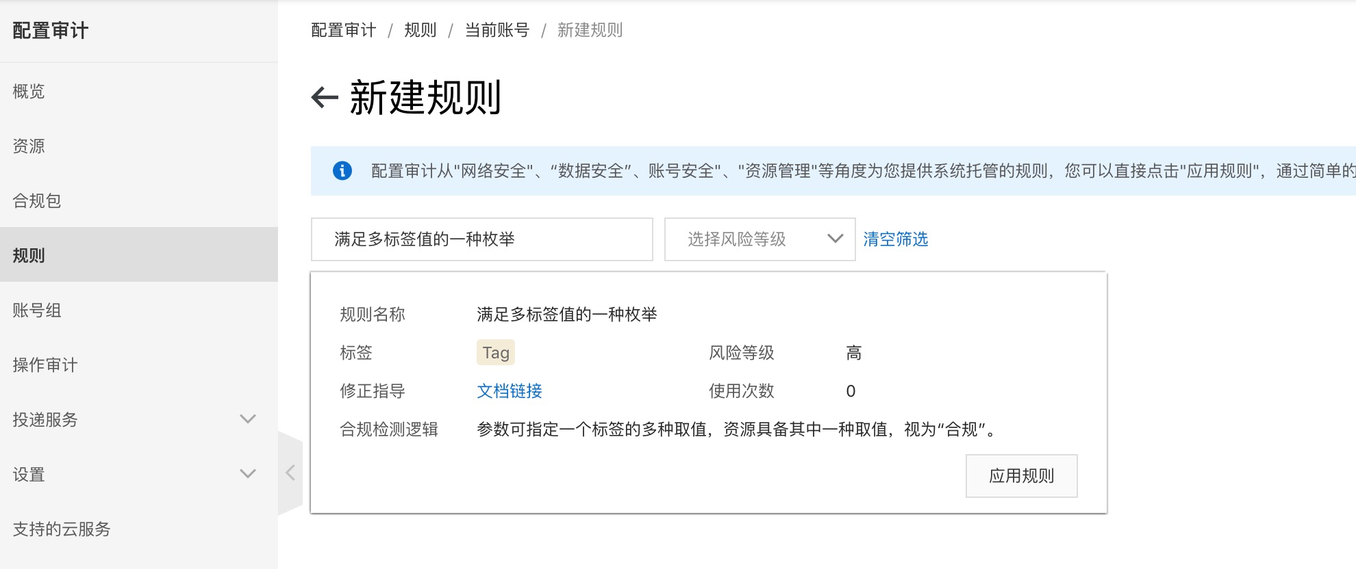 步骤二 在规则 -> 新建规则 -> 选择内置的一条规则模板(满足多标签值的一种枚举)