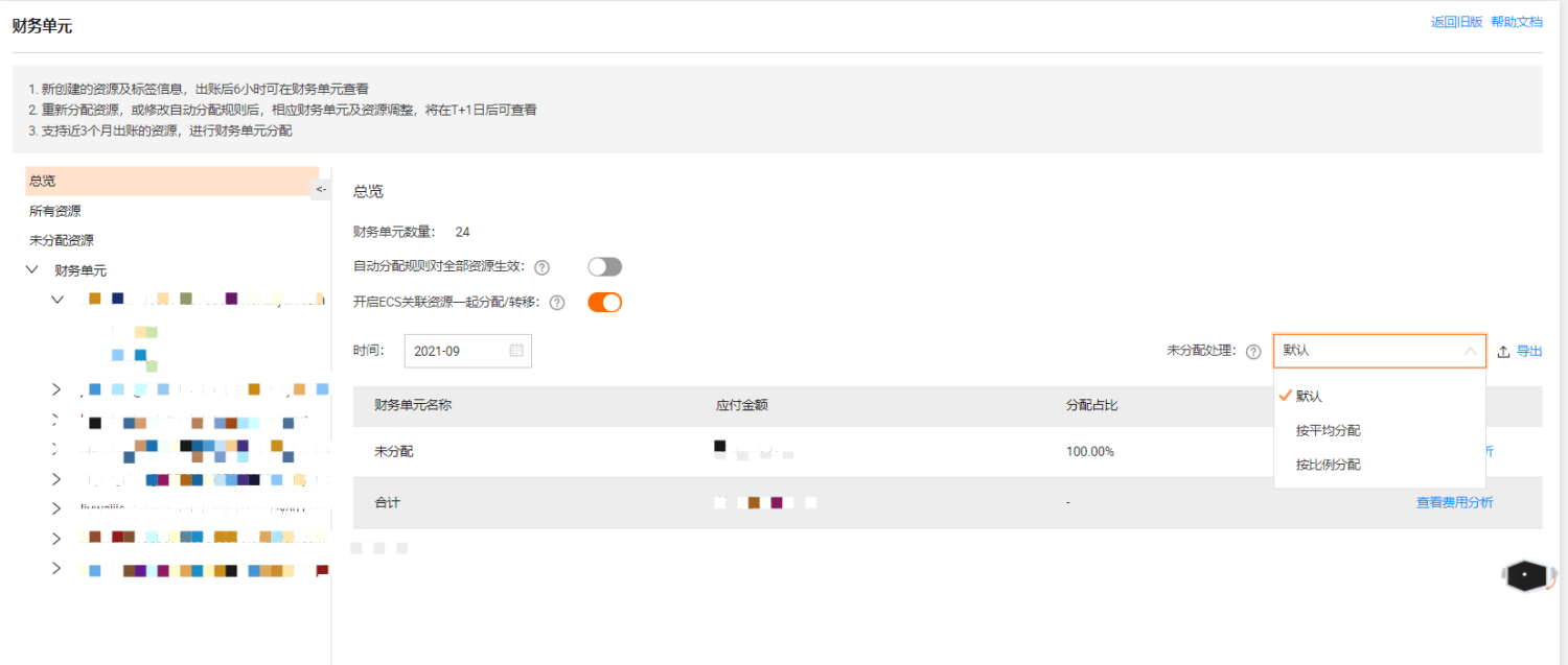 - 按比例分配:未分配金额,将按照财务单元的消费金额,同比例分配;