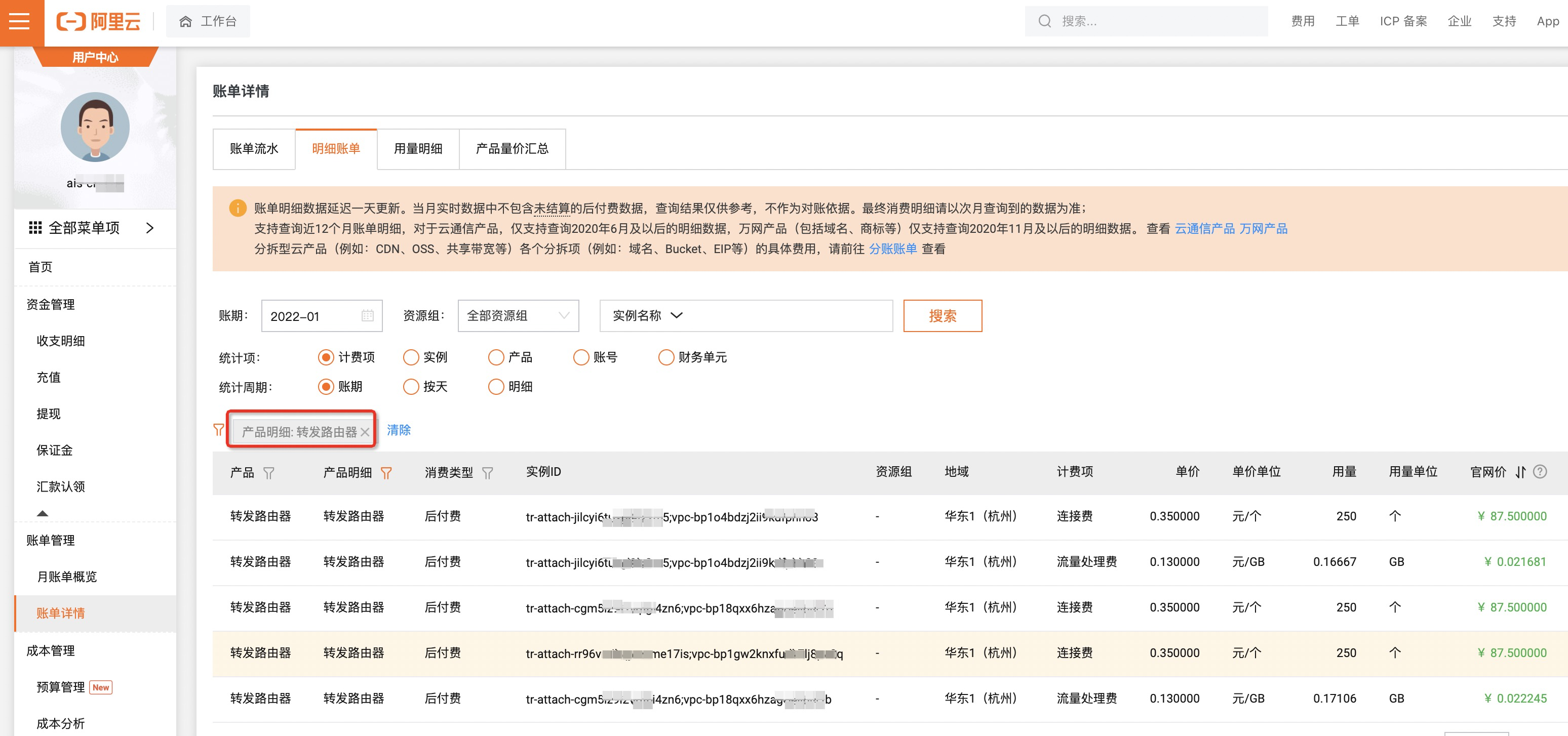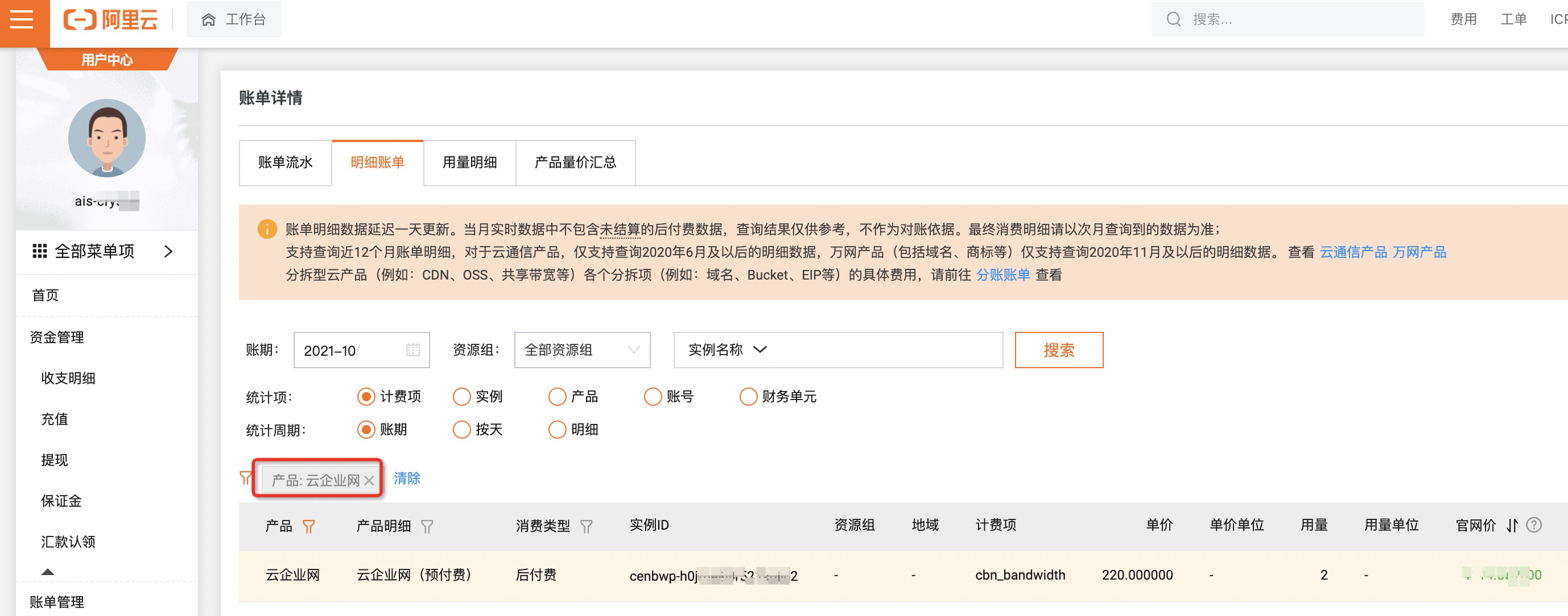 步骤1 登录用户中心->费用管理->分账账单进入分账账单页面。