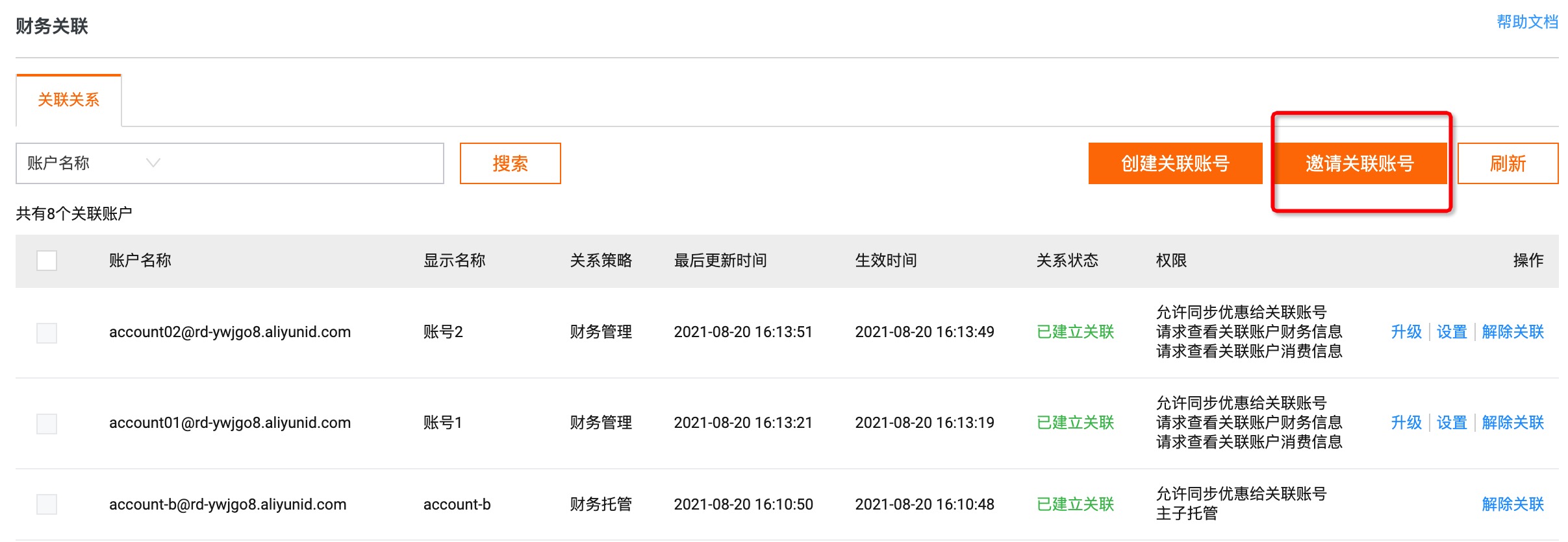 注意:在资源目录中将账号关系建立起来。资源目录中创建的账号默认可以直接配置财务托管关系。财务管理需要再去企业财务侧完成配置。
