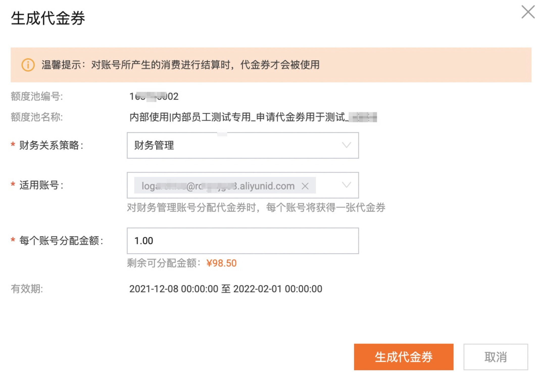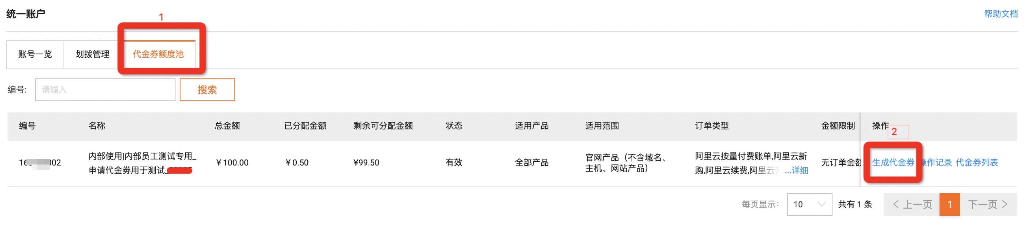 - 进入统一账户 -> 代金券额度池页面,即“生成代金券”入口。