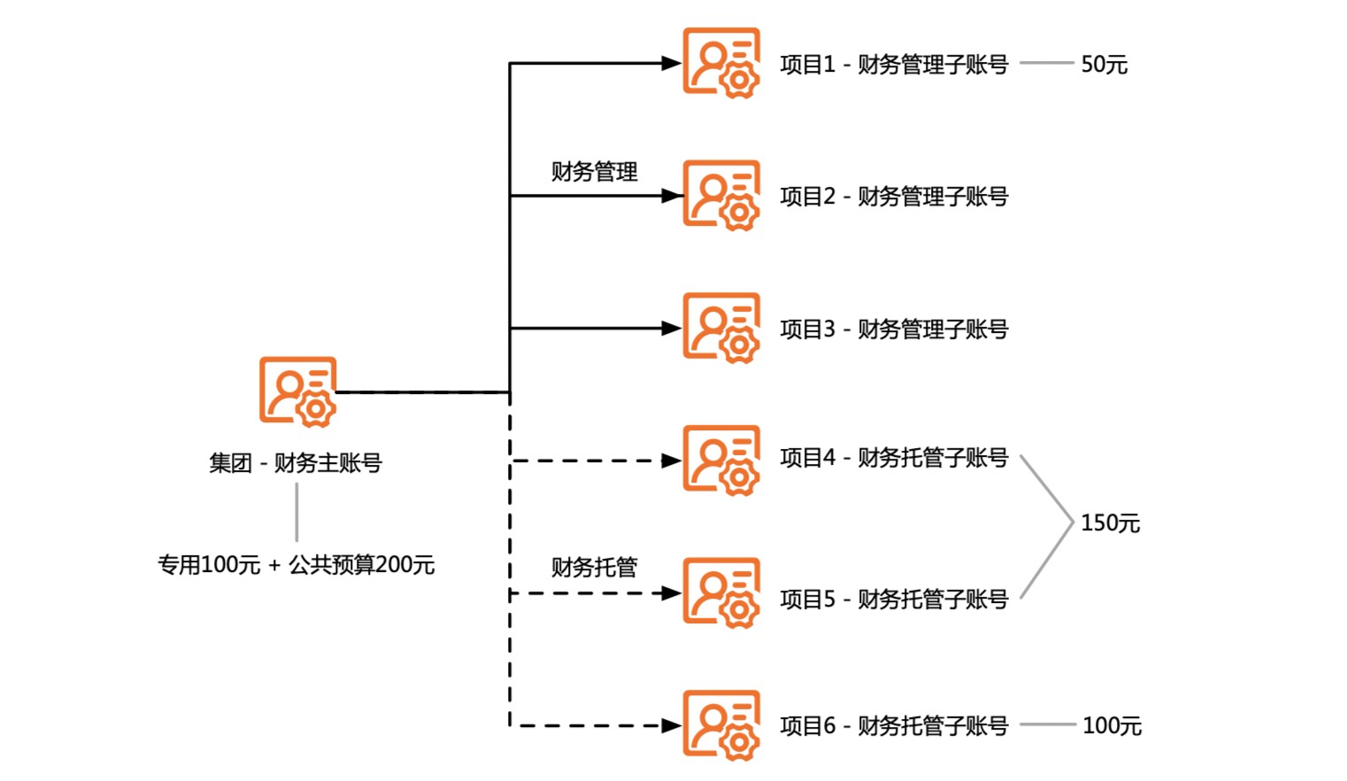 - 公共预算需求建立财务托管关系,只要财务主账号有钱,财务子账号就可以用,子账号不需要关心钱如何充值、如何还款。