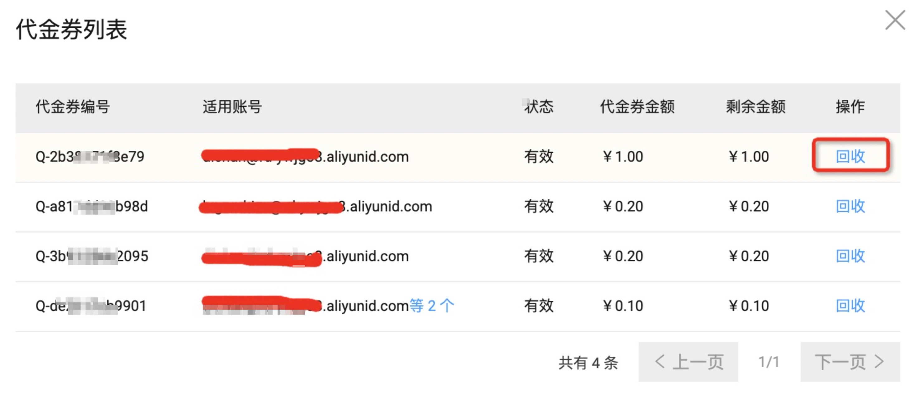 - 回收代金券余额:,每个“代金券额度池”右侧“代金券列表”入口均支持回收代金券剩余金额。