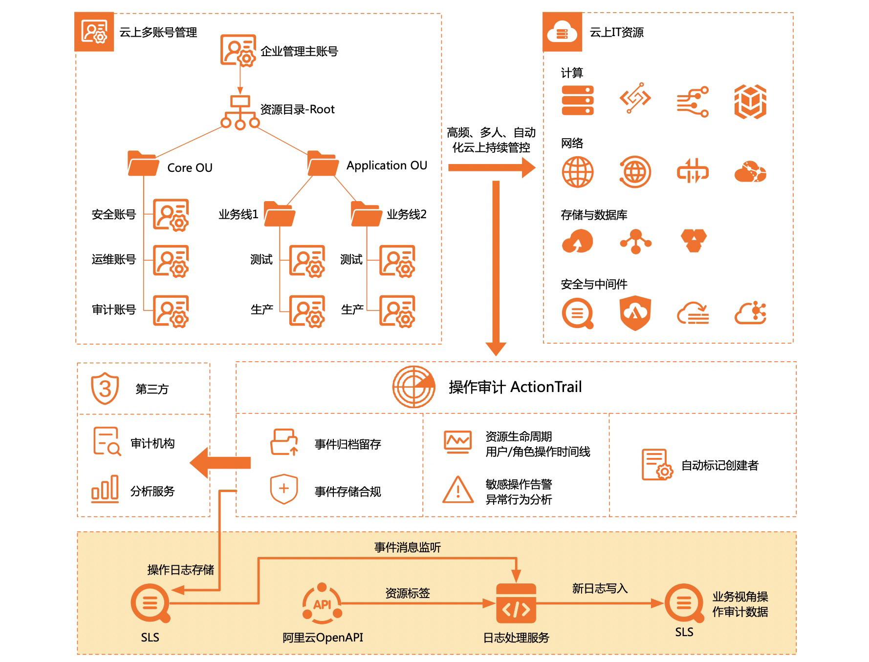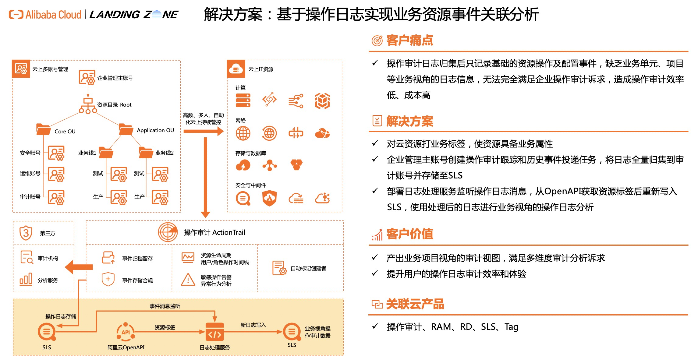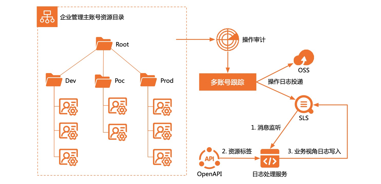 本方案以多账号操作日志统一归集与审计及资源标签为基础,通过搭建日志处理服务,为操作日志新增具有业务语义的资源标签,向企业提供业务视角的审计日志查询方案。