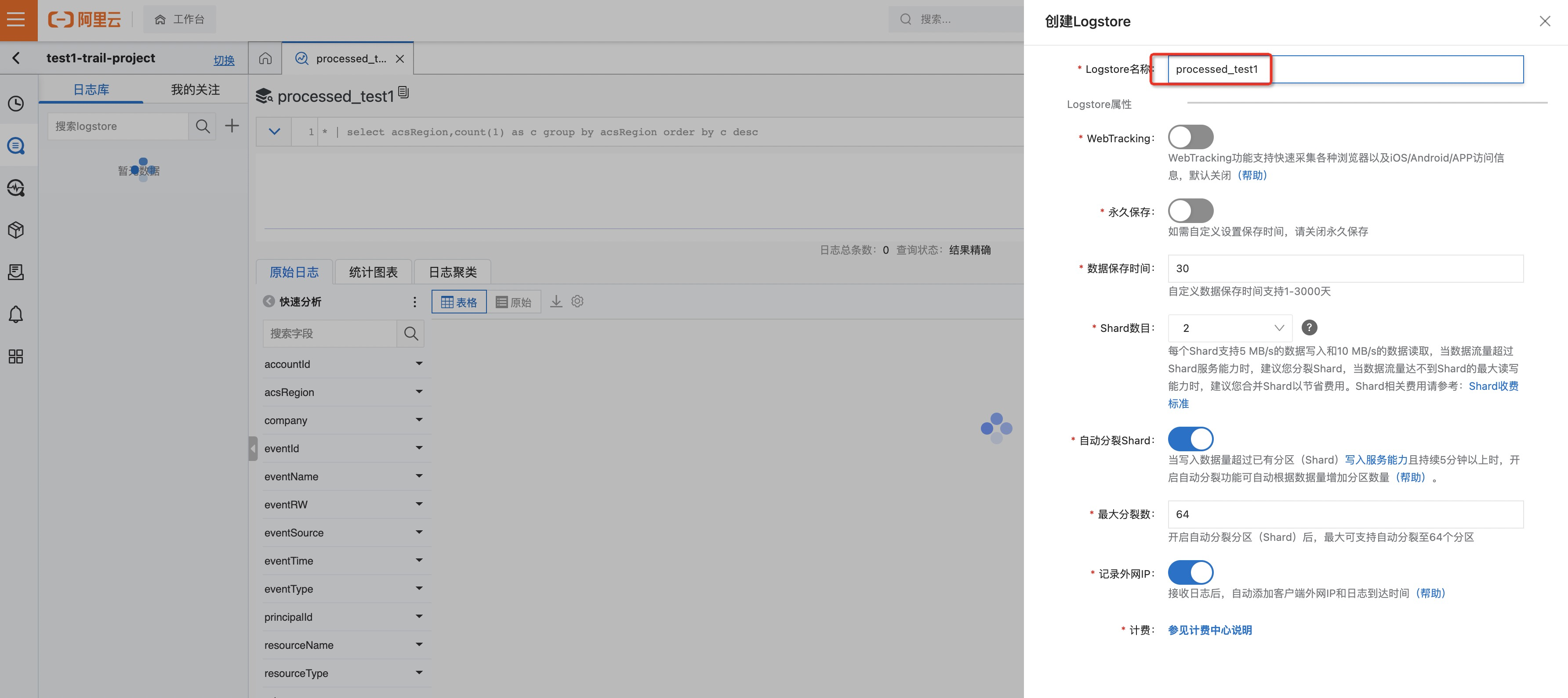 - 在审计账号SLS创建新LogStore用于业务视角的日志存储,创建RAM用户及AccessKey用于供日志处理服务监听SLS消息、写入新LogStore。
