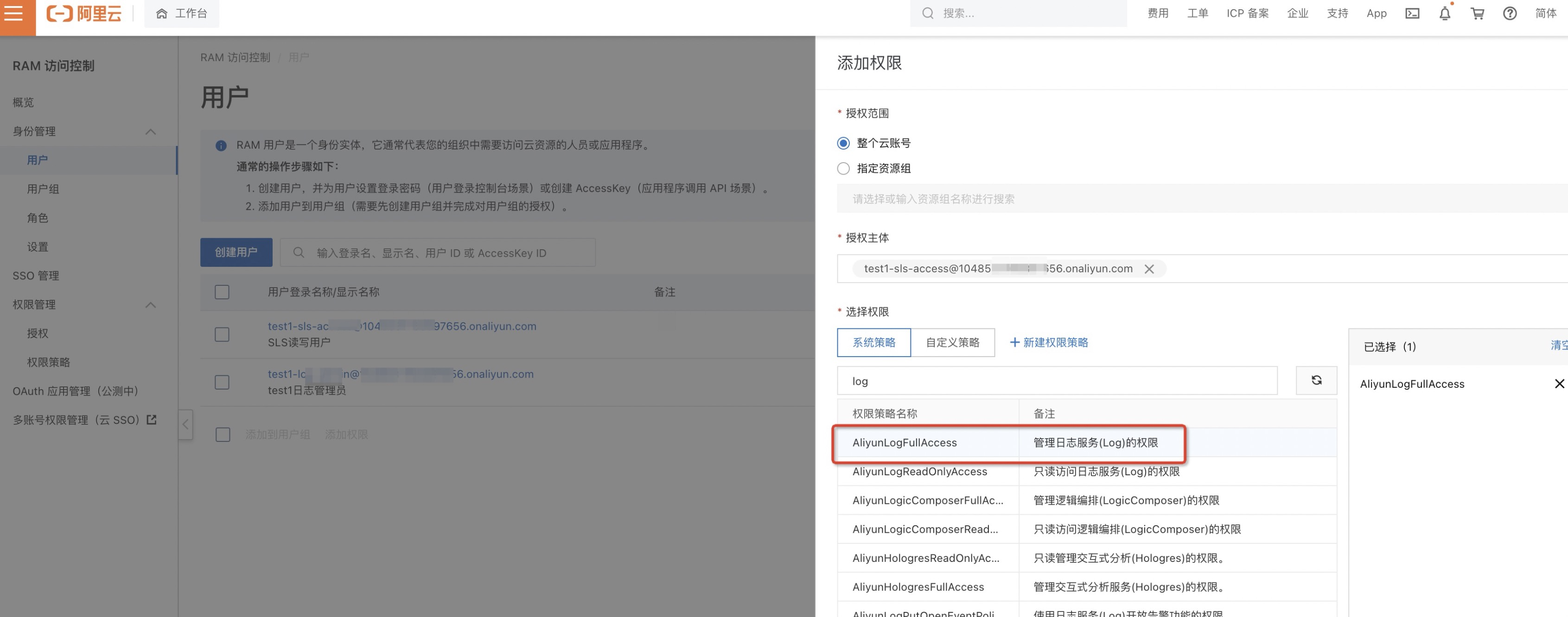 - 在企业管理账号创建只读权限的RAM用户及AccessKey,用于日志处理服务读取所有账号的资源标签。